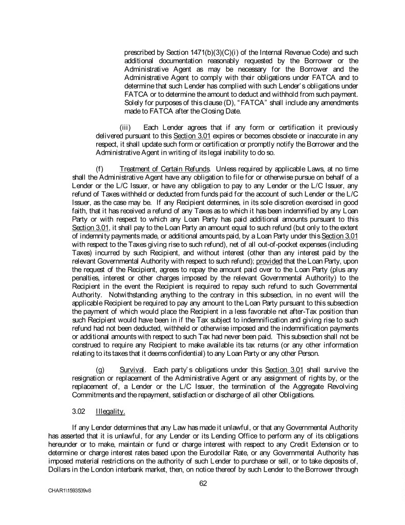 prescribed by Section 1471(b)(3)(C)(i) of the Internal Revenue Code) and such additional documentation reasonably requested by the Borrower or the Administrative Agent as may be necessary for the Borrower and the Administrative Agent to comply with their obligations under FATCA and to determine that such Lender has complied with such Lender’s obligations under FATCA or to determine the amount to deduct and withhold from such payment. Solely for purposes of this clause (D), “FATCA” shall include any amendments made to FATCA after the Closing Date. (iii) Each Lender agrees that if any form or certification it previously delivered pursuant to this Section 3.01 expires or becomes obsolete or inaccurate in any respect, it shall update such form or certification or promptly notify the Borrower and the Administrative Agent in writing of its legal inability to do so. (f) Treatment of Certain Refunds. Unless required by applicable Laws, at no time shall the Administrative Agent have any obligation to file for or otherwise pursue on behalf of a Lender or the L/C Issuer, or have any obligation to pay to any Lender or the L/C Issuer, any refund of Taxes withheld or deducted from funds paid for the account of such Lender or the L/C Issuer, as the case may be. If any Recipient determines, in its sole discretion exercised in good faith, that it has received a refund of any Taxes as to which it has been indemnified by any Loan Party or with respect to which any Loan Party has paid additional amounts pursuant to this Section 3.01, it shall pay to the Loan Party an amount equal to such refund (but only to the extent of indemnity payments made, or additional amounts paid, by a Loan Party under this Section 3.01 with respect to the Taxes giving rise to such refund), net of all out-of-pocket expenses (including Taxes) incurred by such Recipient, and without interest (other than any interest paid by the relevant Governmental Authority with respect to such refund); provided that the Loan Party, upon the request of the Recipient, agrees to repay the amount paid over to the Loan Party (plus any penalties, interest or other charges imposed by the relevant Governmental Authority) to the Recipient in the event the Recipient is required to repay such refund to such Governmental Authority. Notwithstanding anything to the contrary in this subsection, in no event will the applicable Recipient be required to pay any amount to the Loan Party pursuant to this subsection the payment of which would place the Recipient in a less favorable net after-Tax position than such Recipient would have been in if the Tax subject to indemnification and giving rise to such refund had not been deducted, withheld or otherwise imposed and the indemnification payments or additional amounts with respect to such Tax had never been paid. This subsection shall not be construed to require any Recipient to make available its tax returns (or any other information relating to its taxes that it deems confidential) to any Loan Party or any other Person. (g) Survival. Each party’s obligations under this Section 3.01 shall survive the resignation or replacement of the Administrative Agent or any assignment of rights by, or the replacement of, a Lender or the L/C Issuer, the termination of the Aggregate Revolving Commitments and the repayment, satisfaction or discharge of all other Obligations. 3.02 Illegality. If any Lender determines that any Law has made it unlawful, or that any Governmental Authority has asserted that it is unlawful, for any Lender or its Lending Office to perform any of its obligations hereunder or to make, maintain or fund or charge interest with respect to any Credit Extension or to determine or charge interest rates based upon the Eurodollar Rate, or any Governmental Authority has imposed material restrictions on the authority of such Lender to purchase or sell, or to take deposits of, Dollars in the London interbank market, then, on notice thereof by such Lender to the Borrower through 62 CHAR1\1593539v8