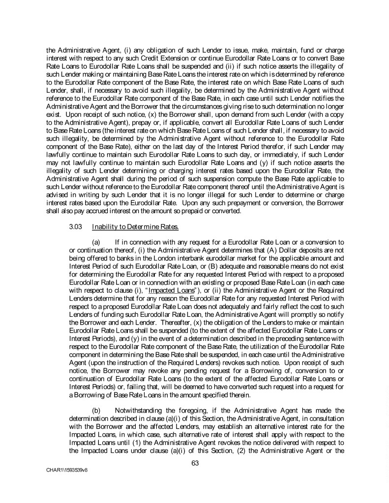 the Administrative Agent, (i) any obligation of such Lender to issue, make, maintain, fund or charge interest with respect to any such Credit Extension or continue Eurodollar Rate Loans or to convert Base Rate Loans to Eurodollar Rate Loans shall be suspended and (ii) if such notice asserts the illegality of such Lender making or maintaining Base Rate Loans the interest rate on which is determined by reference to the Eurodollar Rate component of the Base Rate, the interest rate on which Base Rate Loans of such Lender, shall, if necessary to avoid such illegality, be determined by the Administrative Agent without reference to the Eurodollar Rate component of the Base Rate, in each case until such Lender notifies the Administrative Agent and the Borrower that the circumstances giving rise to such determination no longer exist. Upon receipt of such notice, (x) the Borrower shall, upon demand from such Lender (with a copy to the Administrative Agent), prepay or, if applicable, convert all Eurodollar Rate Loans of such Lender to Base Rate Loans (the interest rate on which Base Rate Loans of such Lender shall, if necessary to avoid such illegality, be determined by the Administrative Agent without reference to the Eurodollar Rate component of the Base Rate), either on the last day of the Interest Period therefor, if such Lender may lawfully continue to maintain such Eurodollar Rate Loans to such day, or immediately, if such Lender may not lawfully continue to maintain such Eurodollar Rate Loans and (y) if such notice asserts the illegality of such Lender determining or charging interest rates based upon the Eurodollar Rate, the Administrative Agent shall during the period of such suspension compute the Base Rate applicable to such Lender without reference to the Eurodollar Rate component thereof until the Administrative Agent is advised in writing by such Lender that it is no longer illegal for such Lender to determine or charge interest rates based upon the Eurodollar Rate. Upon any such prepayment or conversion, the Borrower shall also pay accrued interest on the amount so prepaid or converted. 3.03 Inability to Determine Rates. (a) If in connection with any request for a Eurodollar Rate Loan or a conversion to or continuation thereof, (i) the Administrative Agent determines that (A) Dollar deposits are not being offered to banks in the London interbank eurodollar market for the applicable amount and Interest Period of such Eurodollar Rate Loan, or (B) adequate and reasonable means do not exist for determining the Eurodollar Rate for any requested Interest Period with respect to a proposed Eurodollar Rate Loan or in connection with an existing or proposed Base Rate Loan (in each case with respect to clause (i), “Impacted Loans”), or (ii) the Administrative Agent or the Required Lenders determine that for any reason the Eurodollar Rate for any requested Interest Period with respect to a proposed Eurodollar Rate Loan does not adequately and fairly reflect the cost to such Lenders of funding such Eurodollar Rate Loan, the Administrative Agent will promptly so notify the Borrower and each Lender. Thereafter, (x) the obligation of the Lenders to make or maintain Eurodollar Rate Loans shall be suspended (to the extent of the affected Eurodollar Rate Loans or Interest Periods), and (y) in the event of a determination described in the preceding sentence with respect to the Eurodollar Rate component of the Base Rate, the utilization of the Eurodollar Rate component in determining the Base Rate shall be suspended, in each case until the Administrative Agent (upon the instruction of the Required Lenders) revokes such notice. Upon receipt of such notice, the Borrower may revoke any pending request for a Borrowing of, conversion to or continuation of Eurodollar Rate Loans (to the extent of the affected Eurodollar Rate Loans or Interest Periods) or, failing that, will be deemed to have converted such request into a request for a Borrowing of Base Rate Loans in the amount specified therein. (b) Notwithstanding the foregoing, if the Administrative Agent has made the determination described in clause (a)(i) of this Section, the Administrative Agent, in consultation with the Borrower and the affected Lenders, may establish an alternative interest rate for the Impacted Loans, in which case, such alternative rate of interest shall apply with respect to the Impacted Loans until (1) the Administrative Agent revokes the notice delivered with respect to the Impacted Loans under clause (a)(i) of this Section, (2) the Administrative Agent or the 63 CHAR1\1593539v8