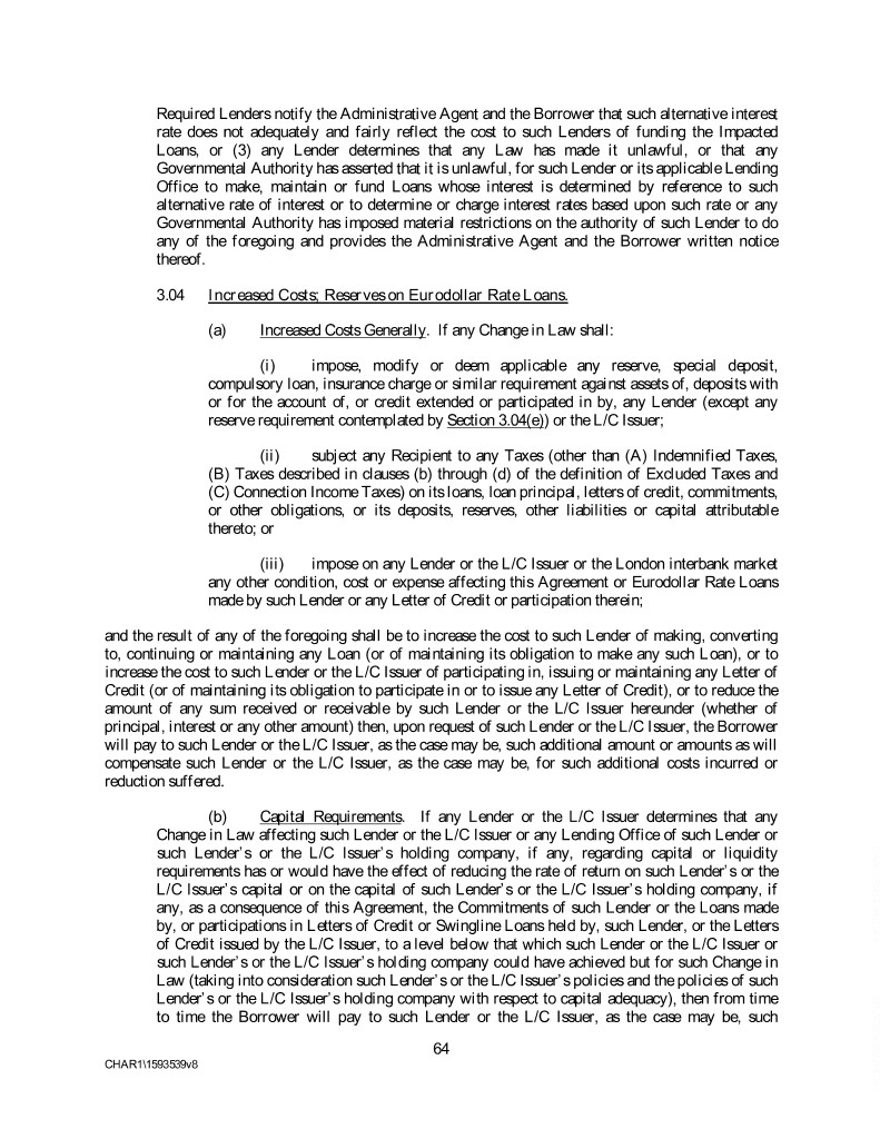 Required Lenders notify the Administrative Agent and the Borrower that such alternative interest rate does not adequately and fairly reflect the cost to such Lenders of funding the Impacted Loans, or (3) any Lender determines that any Law has made it unlawful, or that any Governmental Authority has asserted that it is unlawful, for such Lender or its applicable Lending Office to make, maintain or fund Loans whose interest is determined by reference to such alternative rate of interest or to determine or charge interest rates based upon such rate or any Governmental Authority has imposed material restrictions on the authority of such Lender to do any of the foregoing and provides the Administrative Agent and the Borrower written notice thereof. 3.04 Increased Costs; Reserves on Eurodollar Rate Loans. (a) Increased Costs Generally. If any Change in Law shall: (i) impose, modify or deem applicable any reserve, special deposit, compulsory loan, insurance charge or similar requirement against assets of, deposits with or for the account of, or credit extended or participated in by, any Lender (except any reserve requirement contemplated by Section 3.04(e)) or the L/C Issuer; (ii) subject any Recipient to any Taxes (other than (A) Indemnified Taxes, (B) Taxes described in clauses (b) through (d) of the definition of Excluded Taxes and (C) Connection Income Taxes) on its loans, loan principal, letters of credit, commitments, or other obligations, or its deposits, reserves, other liabilities or capital attributable thereto; or (iii) impose on any Lender or the L/C Issuer or the London interbank market any other condition, cost or expense affecting this Agreement or Eurodollar Rate Loans made by such Lender or any Letter of Credit or participation therein; and the result of any of the foregoing shall be to increase the cost to such Lender of making, converting to, continuing or maintaining any Loan (or of maintaining its obligation to make any such Loan), or to increase the cost to such Lender or the L/C Issuer of participating in, issuing or maintaining any Letter of Credit (or of maintaining its obligation to participate in or to issue any Letter of Credit), or to reduce the amount of any sum received or receivable by such Lender or the L/C Issuer hereunder (whether of principal, interest or any other amount) then, upon request of such Lender or the L/C Issuer, the Borrower will pay to such Lender or the L/C Issuer, as the case may be, such additional amount or amounts as will compensate such Lender or the L/C Issuer, as the case may be, for such additional costs incurred or reduction suffered. (b) Capital Requirements. If any Lender or the L/C Issuer determines that any Change in Law affecting such Lender or the L/C Issuer or any Lending Office of such Lender or such Lender’s or the L/C Issuer’s holding company, if any, regarding capital or liquidity requirements has or would have the effect of reducing the rate of return on such Lender’s or the L/C Issuer’s capital or on the capital of such Lender’s or the L/C Issuer’s holding company, if any, as a consequence of this Agreement, the Commitments of such Lender or the Loans made by, or participations in Letters of Credit or Swingline Loans held by, such Lender, or the Letters of Credit issued by the L/C Issuer, to a level below that which such Lender or the L/C Issuer or such Lender’s or the L/C Issuer’s holding company could have achieved but for such Change in Law (taking into consideration such Lender’s or the L/C Issuer’s policies and the policies of such Lender’s or the L/C Issuer’s holding company with respect to capital adequacy), then from time to time the Borrower will pay to such Lender or the L/C Issuer, as the case may be, such 64 CHAR1\1593539v8