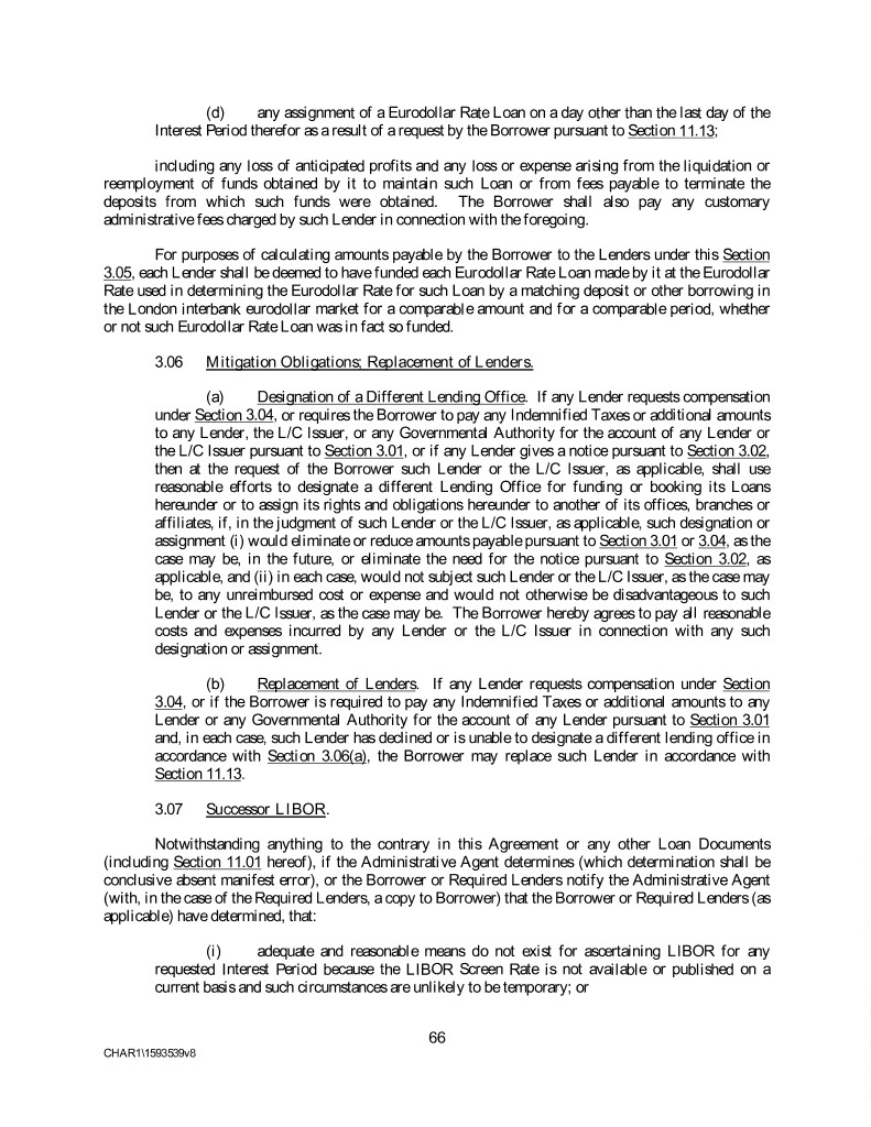 (d) any assignment of a Eurodollar Rate Loan on a day other than the last day of the Interest Period therefor as a result of a request by the Borrower pursuant to Section 11.13; including any loss of anticipated profits and any loss or expense arising from the liquidation or reemployment of funds obtained by it to maintain such Loan or from fees payable to terminate the deposits from which such funds were obtained. The Borrower shall also pay any customary administrative fees charged by such Lender in connection with the foregoing. For purposes of calculating amounts payable by the Borrower to the Lenders under this Section 3.05, each Lender shall be deemed to have funded each Eurodollar Rate Loan made by it at the Eurodollar Rate used in determining the Eurodollar Rate for such Loan by a matching deposit or other borrowing in the London interbank eurodollar market for a comparable amount and for a comparable period, whether or not such Eurodollar Rate Loan was in fact so funded. 3.06 Mitigation Obligations; Replacement of Lenders. (a) Designation of a Different Lending Office. If any Lender requests compensation under Section 3.04, or requires the Borrower to pay any Indemnified Taxes or additional amounts to any Lender, the L/C Issuer, or any Governmental Authority for the account of any Lender or the L/C Issuer pursuant to Section 3.01, or if any Lender gives a notice pursuant to Section 3.02, then at the request of the Borrower such Lender or the L/C Issuer, as applicable, shall use reasonable efforts to designate a different Lending Office for funding or booking its Loans hereunder or to assign its rights and obligations hereunder to another of its offices, branches or affiliates, if, in the judgment of such Lender or the L/C Issuer, as applicable, such designation or assignment (i) would eliminate or reduce amounts payable pursuant to Section 3.01 or 3.04, as the case may be, in the future, or eliminate the need for the notice pursuant to Section 3.02, as applicable, and (ii) in each case, would not subject such Lender or the L/C Issuer, as the case may be, to any unreimbursed cost or expense and would not otherwise be disadvantageous to such Lender or the L/C Issuer, as the case may be. The Borrower hereby agrees to pay all reasonable costs and expenses incurred by any Lender or the L/C Issuer in connection with any such designation or assignment. (b) Replacement of Lenders. If any Lender requests compensation under Section 3.04, or if the Borrower is required to pay any Indemnified Taxes or additional amounts to any Lender or any Governmental Authority for the account of any Lender pursuant to Section 3.01 and, in each case, such Lender has declined or is unable to designate a different lending office in accordance with Section 3.06(a), the Borrower may replace such Lender in accordance with Section 11.13. 3.07 Successor LIBOR. Notwithstanding anything to the contrary in this Agreement or any other Loan Documents (including Section 11.01 hereof), if the Administrative Agent determines (which determination shall be conclusive absent manifest error), or the Borrower or Required Lenders notify the Administrative Agent (with, in the case of the Required Lenders, a copy to Borrower) that the Borrower or Required Lenders (as applicable) have determined, that: (i) adequate and reasonable means do not exist for ascertaining LIBOR for any requested Interest Period because the LIBOR Screen Rate is not available or published on a current basis and such circumstances are unlikely to be temporary; or 66 CHAR1\1593539v8