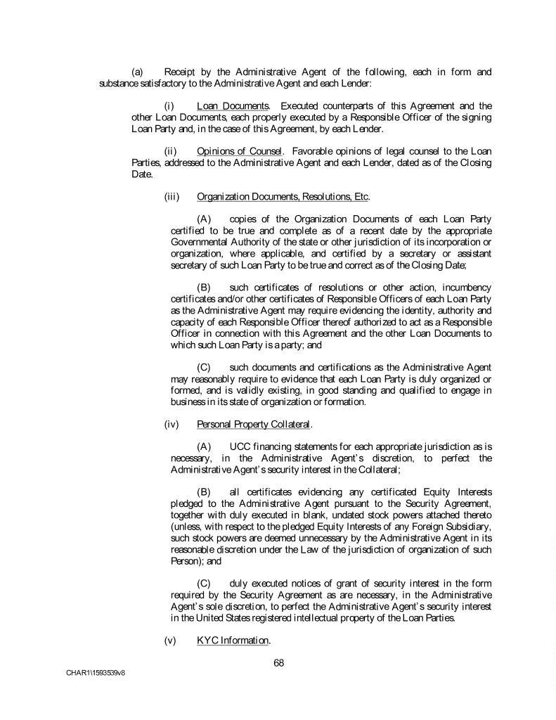 (a) Receipt by the Administrative Agent of the following, each in form and substance satisfactory to the Administrative Agent and each Lender: (i) Loan Documents. Executed counterparts of this Agreement and the other Loan Documents, each properly executed by a Responsible Officer of the signing Loan Party and, in the case of this Agreement, by each Lender. (ii) Opinions of Counsel. Favorable opinions of legal counsel to the Loan Parties, addressed to the Administrative Agent and each Lender, dated as of the Closing Date. (iii) Organization Documents, Resolutions, Etc. (A) copies of the Organization Documents of each Loan Party certified to be true and complete as of a recent date by the appropriate Governmental Authority of the state or other jurisdiction of its incorporation or organization, where applicable, and certified by a secretary or assistant secretary of such Loan Party to be true and correct as of the Closing Date; (B) such certificates of resolutions or other action, incumbency certificates and/or other certificates of Responsible Officers of each Loan Party as the Administrative Agent may require evidencing the identity, authority and capacity of each Responsible Officer thereof authorized to act as a Responsible Officer in connection with this Agreement and the other Loan Documents to which such Loan Party is a party; and (C) such documents and certifications as the Administrative Agent may reasonably require to evidence that each Loan Party is duly organized or formed, and is validly existing, in good standing and qualified to engage in business in its state of organization or formation. (iv) Personal Property Collateral. (A) UCC financing statements for each appropriate jurisdiction as is necessary, in the Administrative Agent’s discretion, to perfect the Administrative Agent’s security interest in the Collateral; (B) all certificates evidencing any certificated Equity Interests pledged to the Administrative Agent pursuant to the Security Agreement, together with duly executed in blank, undated stock powers attached thereto (unless, with respect to the pledged Equity Interests of any Foreign Subsidiary, such stock powers are deemed unnecessary by the Administrative Agent in its reasonable discretion under the Law of the jurisdiction of organization of such Person); and (C) duly executed notices of grant of security interest in the form required by the Security Agreement as are necessary, in the Administrative Agent’s sole discretion, to perfect the Administrative Agent’s security interest in the United States registered intellectual property of the Loan Parties. (v) KYC Information. 68 CHAR1\1593539v8