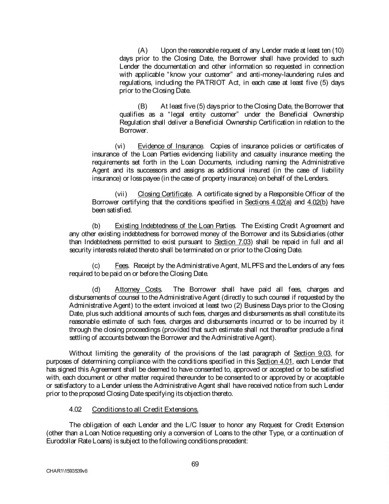 (A) Upon the reasonable request of any Lender made at least ten (10) days prior to the Closing Date, the Borrower shall have provided to such Lender the documentation and other information so requested in connection with applicable “know your customer” and anti-money-laundering rules and regulations, including the PATRIOT Act, in each case at least five (5) days prior to the Closing Date. (B) At least five (5) days prior to the Closing Date, the Borrower that qualifies as a “legal entity customer” under the Beneficial Ownership Regulation shall deliver a Beneficial Ownership Certification in relation to the Borrower. (vi) Evidence of Insurance. Copies of insurance policies or certificates of insurance of the Loan Parties evidencing liability and casualty insurance meeting the requirements set forth in the Loan Documents, including naming the Administrative Agent and its successors and assigns as additional insured (in the case of liability insurance) or loss payee (in the case of property insurance) on behalf of the Lenders. (vii) Closing Certificate. A certificate signed by a Responsible Officer of the Borrower certifying that the conditions specified in Sections 4.02(a) and 4.02(b) have been satisfied. (b) Existing Indebtedness of the Loan Parties. The Existing Credit Agreement and any other existing indebtedness for borrowed money of the Borrower and its Subsidiaries (other than Indebtedness permitted to exist pursuant to Section 7.03) shall be repaid in full and all security interests related thereto shall be terminated on or prior to the Closing Date. (c) Fees. Receipt by the Administrative Agent, MLPFS and the Lenders of any fees required to be paid on or before the Closing Date. (d) Attorney Costs. The Borrower shall have paid all fees, charges and disbursements of counsel to the Administrative Agent (directly to such counsel if requested by the Administrative Agent) to the extent invoiced at least two (2) Business Days prior to the Closing Date, plus such additional amounts of such fees, charges and disbursements as shall constitute its reasonable estimate of such fees, charges and disbursements incurred or to be incurred by it through the closing proceedings (provided that such estimate shall not thereafter preclude a final settling of accounts between the Borrower and the Administrative Agent). Without limiting the generality of the provisions of the last paragraph of Section 9.03, for purposes of determining compliance with the conditions specified in this Section 4.01, each Lender that has signed this Agreement shall be deemed to have consented to, approved or accepted or to be satisfied with, each document or other matter required thereunder to be consented to or approved by or acceptable or satisfactory to a Lender unless the Administrative Agent shall have received notice from such Lender prior to the proposed Closing Date specifying its objection thereto. 4.02 Conditions to all Credit Extensions. The obligation of each Lender and the L/C Issuer to honor any Request for Credit Extension (other than a Loan Notice requesting only a conversion of Loans to the other Type, or a continuation of Eurodollar Rate Loans) is subject to the following conditions precedent: 69 CHAR1\1593539v8