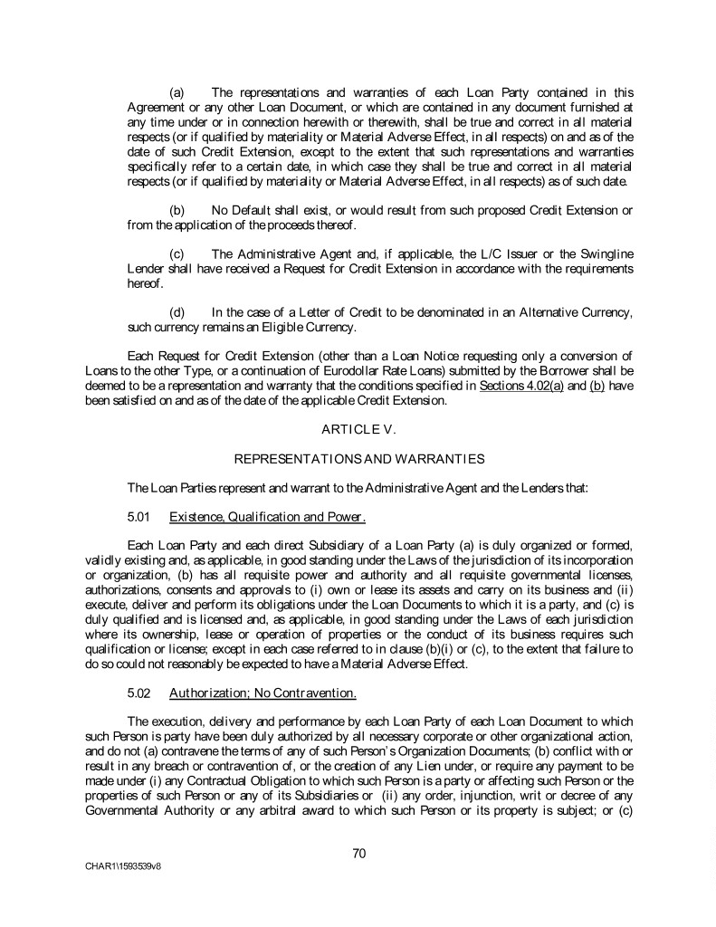 (a) The representations and warranties of each Loan Party contained in this Agreement or any other Loan Document, or which are contained in any document furnished at any time under or in connection herewith or therewith, shall be true and correct in all material respects (or if qualified by materiality or Material Adverse Effect, in all respects) on and as of the date of such Credit Extension, except to the extent that such representations and warranties specifically refer to a certain date, in which case they shall be true and correct in all material respects (or if qualified by materiality or Material Adverse Effect, in all respects) as of such date. (b) No Default shall exist, or would result from such proposed Credit Extension or from the application of the proceeds thereof. (c) The Administrative Agent and, if applicable, the L/C Issuer or the Swingline Lender shall have received a Request for Credit Extension in accordance with the requirements hereof. (d) In the case of a Letter of Credit to be denominated in an Alternative Currency, such currency remains an Eligible Currency. Each Request for Credit Extension (other than a Loan Notice requesting only a conversion of Loans to the other Type, or a continuation of Eurodollar Rate Loans) submitted by the Borrower shall be deemed to be a representation and warranty that the conditions specified in Sections 4.02(a) and (b) have been satisfied on and as of the date of the applicable Credit Extension. ARTICLE V. REPRESENTATIONS AND WARRANTIES The Loan Parties represent and warrant to the Administrative Agent and the Lenders that: 5.01 Existence, Qualification and Power. Each Loan Party and each direct Subsidiary of a Loan Party (a) is duly organized or formed, validly existing and, as applicable, in good standing under the Laws of the jurisdiction of its incorporation or organization, (b) has all requisite power and authority and all requisite governmental licenses, authorizations, consents and approvals to (i) own or lease its assets and carry on its business and (ii) execute, deliver and perform its obligations under the Loan Documents to which it is a party, and (c) is duly qualified and is licensed and, as applicable, in good standing under the Laws of each jurisdiction where its ownership, lease or operation of properties or the conduct of its business requires such qualification or license; except in each case referred to in clause (b)(i) or (c), to the extent that failure to do so could not reasonably be expected to have a Material Adverse Effect. 5.02 Authorization; No Contravention. The execution, delivery and performance by each Loan Party of each Loan Document to which such Person is party have been duly authorized by all necessary corporate or other organizational action, and do not (a) contravene the terms of any of such Person’s Organization Documents; (b) conflict with or result in any breach or contravention of, or the creation of any Lien under, or require any payment to be made under (i) any Contractual Obligation to which such Person is a party or affecting such Person or the properties of such Person or any of its Subsidiaries or (ii) any order, injunction, writ or decree of any Governmental Authority or any arbitral award to which such Person or its property is subject; or (c) 70 CHAR1\1593539v8