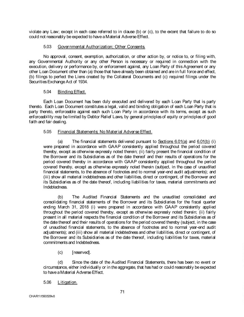 violate any Law; except in each case referred to in clause (b) or (c), to the extent that failure to do so could not reasonably be expected to have a Material Adverse Effect. 5.03 Governmental Authorization; Other Consents. No approval, consent, exemption, authorization, or other action by, or notice to, or filing with, any Governmental Authority or any other Person is necessary or required in connection with the execution, delivery or performance by, or enforcement against, any Loan Party of this Agreement or any other Loan Document other than (a) those that have already been obtained and are in full force and effect, (b) filings to perfect the Liens created by the Collateral Documents and (c) required filings under the Securities Exchange Act of 1934. 5.04 Binding Effect. Each Loan Document has been duly executed and delivered by each Loan Party that is party thereto. Each Loan Document constitutes a legal, valid and binding obligation of each Loan Party that is party thereto, enforceable against each such Loan Party in accordance with its terms, except as such enforceability may be limited by Debtor Relief Laws, by general principles of equity or principles of good faith and fair dealing. 5.05 Financial Statements; No Material Adverse Effect. (a) The financial statements delivered pursuant to Sections 6.01(a) and 6.01(b) (i) were prepared in accordance with GAAP consistently applied throughout the period covered thereby, except as otherwise expressly noted therein; (ii) fairly present the financial condition of the Borrower and its Subsidiaries as of the date thereof and their results of operations for the period covered thereby in accordance with GAAP consistently applied throughout the period covered thereby, except as otherwise expressly noted therein (subject, in the case of unaudited financial statements, to the absence of footnotes and to normal year-end audit adjustments); and (iii) show all material indebtedness and other liabilities, direct or contingent, of the Borrower and its Subsidiaries as of the date thereof, including liabilities for taxes, material commitments and Indebtedness. (b) The Audited Financial Statements and the unaudited consolidated and consolidating financial statements of the Borrower and its Subsidiaries for the fiscal quarter ending March 31, 2018 (i) were prepared in accordance with GAAP consistently applied throughout the period covered thereby, except as otherwise expressly noted therein; (ii) fairly present in all material respects the financial condition of the Borrower and its Subsidiaries as of the date thereof and their results of operations for the period covered thereby (subject, in the case of unaudited financial statements, to the absence of footnotes and to normal year-end audit adjustments); and (iii) show all material indebtedness and other liabilities, direct or contingent, of the Borrower and its Subsidiaries as of the date thereof, including liabilities for taxes, material commitments and Indebtedness. (c) [reserved]. (d) Since the date of the Audited Financial Statements, there has been no event or circumstance, either individually or in the aggregate, that has had or could reasonably be expected to have a Material Adverse Effect. 5.06 Litigation. 71 CHAR1\1593539v8