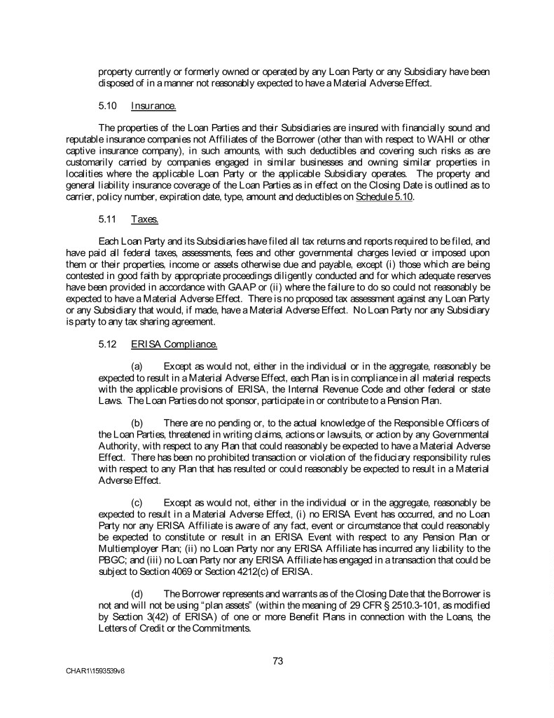 property currently or formerly owned or operated by any Loan Party or any Subsidiary have been disposed of in a manner not reasonably expected to have a Material Adverse Effect. 5.10 Insurance. The properties of the Loan Parties and their Subsidiaries are insured with financially sound and reputable insurance companies not Affiliates of the Borrower (other than with respect to WAHI or other captive insurance company), in such amounts, with such deductibles and covering such risks as are customarily carried by companies engaged in similar businesses and owning similar properties in localities where the applicable Loan Party or the applicable Subsidiary operates. The property and general liability insurance coverage of the Loan Parties as in effect on the Closing Date is outlined as to carrier, policy number, expiration date, type, amount and deductibles on Schedule 5.10. 5.11 Taxes. Each Loan Party and its Subsidiaries have filed all tax returns and reports required to be filed, and have paid all federal taxes, assessments, fees and other governmental charges levied or imposed upon them or their properties, income or assets otherwise due and payable, except (i) those which are being contested in good faith by appropriate proceedings diligently conducted and for which adequate reserves have been provided in accordance with GAAP or (ii) where the failure to do so could not reasonably be expected to have a Material Adverse Effect. There is no proposed tax assessment against any Loan Party or any Subsidiary that would, if made, have a Material Adverse Effect. No Loan Party nor any Subsidiary is party to any tax sharing agreement. 5.12 ERISA Compliance. (a) Except as would not, either in the individual or in the aggregate, reasonably be expected to result in a Material Adverse Effect, each Plan is in compliance in all material respects with the applicable provisions of ERISA, the Internal Revenue Code and other federal or state Laws. The Loan Parties do not sponsor, participate in or contribute to a Pension Plan. (b) There are no pending or, to the actual knowledge of the Responsible Officers of the Loan Parties, threatened in writing claims, actions or lawsuits, or action by any Governmental Authority, with respect to any Plan that could reasonably be expected to have a Material Adverse Effect. There has been no prohibited transaction or violation of the fiduciary responsibility rules with respect to any Plan that has resulted or could reasonably be expected to result in a Material Adverse Effect. (c) Except as would not, either in the individual or in the aggregate, reasonably be expected to result in a Material Adverse Effect, (i) no ERISA Event has occurred, and no Loan Party nor any ERISA Affiliate is aware of any fact, event or circumstance that could reasonably be expected to constitute or result in an ERISA Event with respect to any Pension Plan or Multiemployer Plan; (ii) no Loan Party nor any ERISA Affiliate has incurred any liability to the PBGC; and (iii) no Loan Party nor any ERISA Affiliate has engaged in a transaction that could be subject to Section 4069 or Section 4212(c) of ERISA. (d) The Borrower represents and warrants as of the Closing Date that the Borrower is not and will not be using “plan assets” (within the meaning of 29 CFR § 2510.3-101, as modified by Section 3(42) of ERISA) of one or more Benefit Plans in connection with the Loans, the Letters of Credit or the Commitments. 73 CHAR1\1593539v8