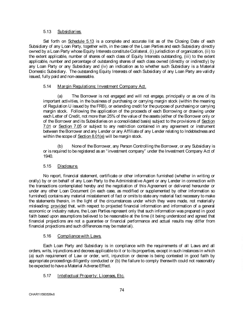 5.13 Subsidiaries. Set forth on Schedule 5.13 is a complete and accurate list as of the Closing Date of each Subsidiary of any Loan Party, together with, in the case of the Loan Parties and each Subsidiary directly owned by a Loan Party whose Equity Interests constitute Collateral, (i) jurisdiction of organization, (ii) to the extent applicable, number of shares of each class of Equity Interests outstanding, (iii) to the extent applicable, number and percentage of outstanding shares of each class owned (directly or indirectly) by any Loan Party or any Subsidiary and (iv) an indication as to whether such Subsidiary is a Material Domestic Subsidiary. The outstanding Equity Interests of each Subsidiary of any Loan Party are validly issued, fully paid and non-assessable. 5.14 Margin Regulations; Investment Company Act. (a) The Borrower is not engaged and will not engage, principally or as one of its important activities, in the business of purchasing or carrying margin stock (within the meaning of Regulation U issued by the FRB), or extending credit for the purpose of purchasing or carrying margin stock. Following the application of the proceeds of each Borrowing or drawing under each Letter of Credit, not more than 25% of the value of the assets (either of the Borrower only or of the Borrower and its Subsidiaries on a consolidated basis) subject to the provisions of Section 7.01 or Section 7.05 or subject to any restriction contained in any agreement or instrument between the Borrower and any Lender or any Affiliate of any Lender relating to Indebtedness and within the scope of Section 8.01(e) will be margin stock. (b) None of the Borrower, any Person Controlling the Borrower, or any Subsidiary is or is required to be registered as an “investment company” under the Investment Company Act of 1940. 5.15 Disclosure. No report, financial statement, certificate or other information furnished (whether in writing or orally) by or on behalf of any Loan Party to the Administrative Agent or any Lender in connection with the transactions contemplated hereby and the negotiation of this Agreement or delivered hereunder or under any other Loan Document (in each case, as modified or supplemented by other information so furnished) contains any material misstatement of fact or omits to state any material fact necessary to make the statements therein, in the light of the circumstances under which they were made, not materially misleading; provided that, with respect to projected financial information and information of a general economic or industry nature, the Loan Parties represent only that such information was prepared in good faith based upon assumptions believed to be reasonable at the time (it being understood and agreed that financial projections are not a guarantee or financial performance and actual results may differ from financial projections and such differences may be material). 5.16 Compliance with Laws. Each Loan Party and Subsidiary is in compliance with the requirements of all Laws and all orders, writs, injunctions and decrees applicable to it or to its properties, except in such instances in which (a) such requirement of Law or order, writ, injunction or decree is being contested in good faith by appropriate proceedings diligently conducted or (b) the failure to comply therewith could not reasonably be expected to have a Material Adverse Effect. 5.17 Intellectual Property; Licenses, Etc. 74 CHAR1\1593539v8
