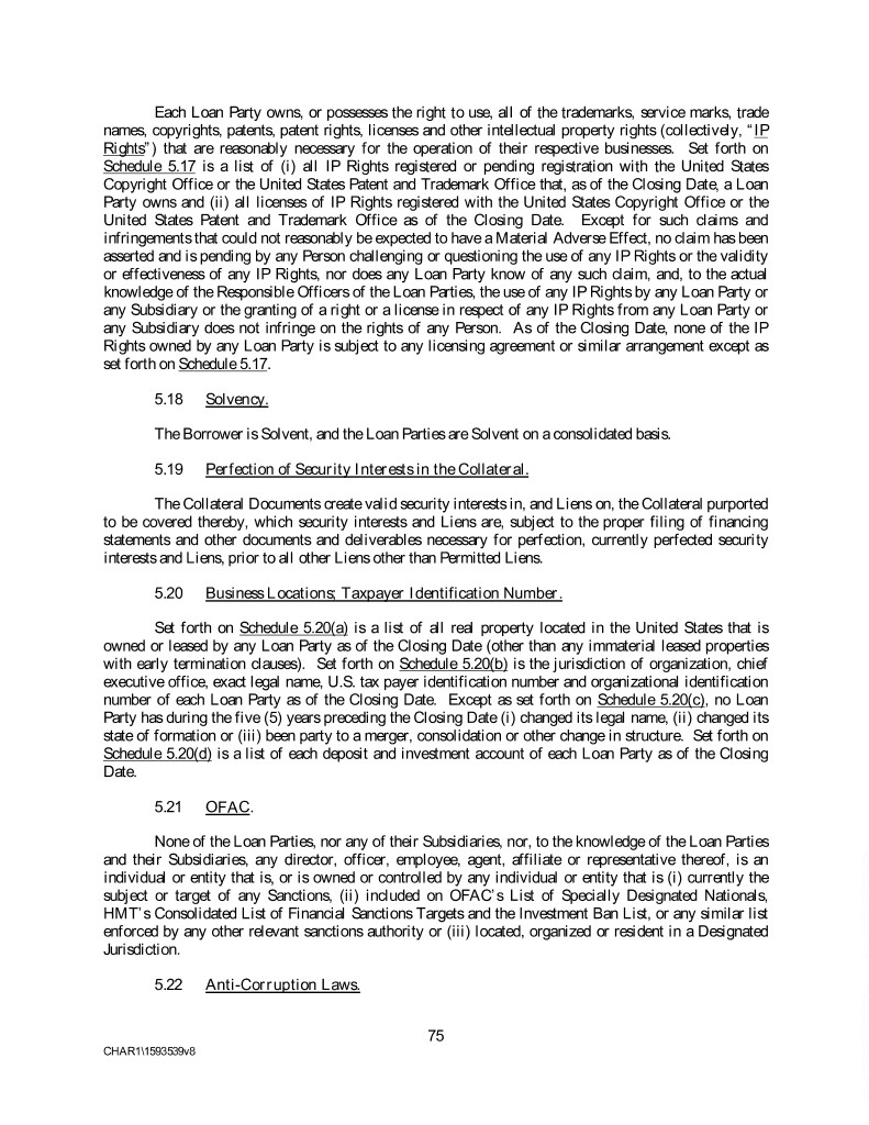 Each Loan Party owns, or possesses the right to use, all of the trademarks, service marks, trade names, copyrights, patents, patent rights, licenses and other intellectual property rights (collectively, “IP Rights”) that are reasonably necessary for the operation of their respective businesses. Set forth on Schedule 5.17 is a list of (i) all IP Rights registered or pending registration with the United States Copyright Office or the United States Patent and Trademark Office that, as of the Closing Date, a Loan Party owns and (ii) all licenses of IP Rights registered with the United States Copyright Office or the United States Patent and Trademark Office as of the Closing Date. Except for such claims and infringements that could not reasonably be expected to have a Material Adverse Effect, no claim has been asserted and is pending by any Person challenging or questioning the use of any IP Rights or the validity or effectiveness of any IP Rights, nor does any Loan Party know of any such claim, and, to the actual knowledge of the Responsible Officers of the Loan Parties, the use of any IP Rights by any Loan Party or any Subsidiary or the granting of a right or a license in respect of any IP Rights from any Loan Party or any Subsidiary does not infringe on the rights of any Person. As of the Closing Date, none of the IP Rights owned by any Loan Party is subject to any licensing agreement or similar arrangement except as set forth on Schedule 5.17. 5.18 Solvency. The Borrower is Solvent, and the Loan Parties are Solvent on a consolidated basis. 5.19 Perfection of Security Interests in the Collateral. The Collateral Documents create valid security interests in, and Liens on, the Collateral purported to be covered thereby, which security interests and Liens are, subject to the proper filing of financing statements and other documents and deliverables necessary for perfection, currently perfected security interests and Liens, prior to all other Liens other than Permitted Liens. 5.20 Business Locations; Taxpayer Identification Number. Set forth on Schedule 5.20(a) is a list of all real property located in the United States that is owned or leased by any Loan Party as of the Closing Date (other than any immaterial leased properties with early termination clauses). Set forth on Schedule 5.20(b) is the jurisdiction of organization, chief executive office, exact legal name, U.S. tax payer identification number and organizational identification number of each Loan Party as of the Closing Date. Except as set forth on Schedule 5.20(c), no Loan Party has during the five (5) years preceding the Closing Date (i) changed its legal name, (ii) changed its state of formation or (iii) been party to a merger, consolidation or other change in structure. Set forth on Schedule 5.20(d) is a list of each deposit and investment account of each Loan Party as of the Closing Date. 5.21 OFAC. None of the Loan Parties, nor any of their Subsidiaries, nor, to the knowledge of the Loan Parties and their Subsidiaries, any director, officer, employee, agent, affiliate or representative thereof, is an individual or entity that is, or is owned or controlled by any individual or entity that is (i) currently the subject or target of any Sanctions, (ii) included on OFAC’s List of Specially Designated Nationals, HMT’s Consolidated List of Financial Sanctions Targets and the Investment Ban List, or any similar list enforced by any other relevant sanctions authority or (iii) located, organized or resident in a Designated Jurisdiction. 5.22 Anti-Corruption Laws. 75 CHAR1\1593539v8
