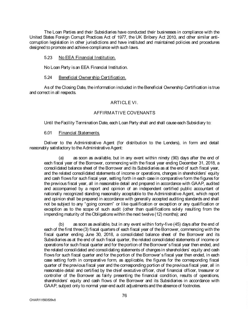The Loan Parties and their Subsidiaries have conducted their businesses in compliance with the United States Foreign Corrupt Practices Act of 1977, the UK Bribery Act 2010, and other similar anti- corruption legislation in other jurisdictions and have instituted and maintained policies and procedures designed to promote and achieve compliance with such laws. 5.23 No EEA Financial Institution. No Loan Party is an EEA Financial Institution. 5.24 Beneficial Ownership Certification. As of the Closing Date, the information included in the Beneficial Ownership Certification is true and correct in all respects. ARTICLE VI. AFFIRMATIVE COVENANTS Until the Facility Termination Date, each Loan Party shall and shall cause each Subsidiary to: 6.01 Financial Statements. Deliver to the Administrative Agent (for distribution to the Lenders), in form and detail reasonably satisfactory to the Administrative Agent: (a) as soon as available, but in any event within ninety (90) days after the end of each fiscal year of the Borrower, commencing with the fiscal year ending December 31, 2018, a consolidated balance sheet of the Borrower and its Subsidiaries as at the end of such fiscal year, and the related consolidated statements of income or operations, changes in shareholders’ equity and cash flows for such fiscal year, setting forth in each case in comparative form the figures for the previous fiscal year, all in reasonable detail and prepared in accordance with GAAP, audited and accompanied by a report and opinion of an independent certified public accountant of nationally recognized standing reasonably acceptable to the Administrative Agent, which report and opinion shall be prepared in accordance with generally accepted auditing standards and shall not be subject to any “going concern” or like qualification or exception or any qualification or exception as to the scope of such audit (other than qualifications solely resulting from the impending maturity of the Obligations within the next twelve (12) months); and (b) as soon as available, but in any event within forty-five (45) days after the end of each of the first three (3) fiscal quarters of each fiscal year of the Borrower, commencing with the fiscal quarter ending June 30, 2018, a consolidated balance sheet of the Borrower and its Subsidiaries as at the end of such fiscal quarter, the related consolidated statements of income or operations for such fiscal quarter and for the portion of the Borrower’s fiscal year then ended, and the related consolidated and consolidating statements of changes in shareholders’ equity and cash flows for such fiscal quarter and for the portion of the Borrower’s fiscal year then ended, in each case setting forth in comparative form, as applicable, the figures for the corresponding fiscal quarter of the previous fiscal year and the corresponding portion of the previous fiscal year, all in reasonable detail and certified by the chief executive officer, chief financial officer, treasurer or controller of the Borrower as fairly presenting the financial condition, results of operations, shareholders’ equity and cash flows of the Borrower and its Subsidiaries in accordance with GAAP, subject only to normal year-end audit adjustments and the absence of footnotes. 76 CHAR1\1593539v8