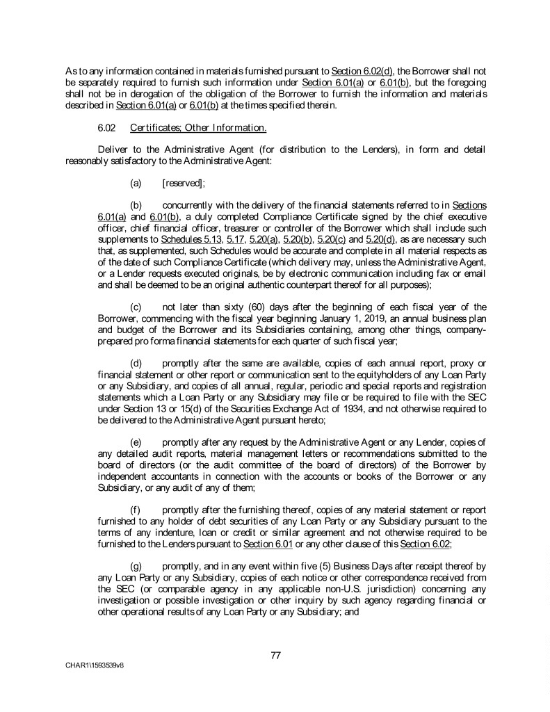 As to any information contained in materials furnished pursuant to Section 6.02(d), the Borrower shall not be separately required to furnish such information under Section 6.01(a) or 6.01(b), but the foregoing shall not be in derogation of the obligation of the Borrower to furnish the information and materials described in Section 6.01(a) or 6.01(b) at the times specified therein. 6.02 Certificates; Other Information. Deliver to the Administrative Agent (for distribution to the Lenders), in form and detail reasonably satisfactory to the Administrative Agent: (a) [reserved]; (b) concurrently with the delivery of the financial statements referred to in Sections 6.01(a) and 6.01(b), a duly completed Compliance Certificate signed by the chief executive officer, chief financial officer, treasurer or controller of the Borrower which shall include such supplements to Schedules 5.13, 5.17, 5.20(a), 5.20(b), 5.20(c) and 5.20(d), as are necessary such that, as supplemented, such Schedules would be accurate and complete in all material respects as of the date of such Compliance Certificate (which delivery may, unless the Administrative Agent, or a Lender requests executed originals, be by electronic communication including fax or email and shall be deemed to be an original authentic counterpart thereof for all purposes); (c) not later than sixty (60) days after the beginning of each fiscal year of the Borrower, commencing with the fiscal year beginning January 1, 2019, an annual business plan and budget of the Borrower and its Subsidiaries containing, among other things, company- prepared pro forma financial statements for each quarter of such fiscal year; (d) promptly after the same are available, copies of each annual report, proxy or financial statement or other report or communication sent to the equityholders of any Loan Party or any Subsidiary, and copies of all annual, regular, periodic and special reports and registration statements which a Loan Party or any Subsidiary may file or be required to file with the SEC under Section 13 or 15(d) of the Securities Exchange Act of 1934, and not otherwise required to be delivered to the Administrative Agent pursuant hereto; (e) promptly after any request by the Administrative Agent or any Lender, copies of any detailed audit reports, material management letters or recommendations submitted to the board of directors (or the audit committee of the board of directors) of the Borrower by independent accountants in connection with the accounts or books of the Borrower or any Subsidiary, or any audit of any of them; (f) promptly after the furnishing thereof, copies of any material statement or report furnished to any holder of debt securities of any Loan Party or any Subsidiary pursuant to the terms of any indenture, loan or credit or similar agreement and not otherwise required to be furnished to the Lenders pursuant to Section 6.01 or any other clause of this Section 6.02; (g) promptly, and in any event within five (5) Business Days after receipt thereof by any Loan Party or any Subsidiary, copies of each notice or other correspondence received from the SEC (or comparable agency in any applicable non-U.S. jurisdiction) concerning any investigation or possible investigation or other inquiry by such agency regarding financial or other operational results of any Loan Party or any Subsidiary; and 77 CHAR1\1593539v8
