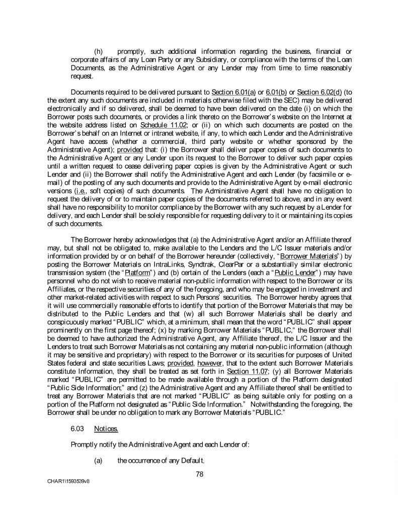 (h) promptly, such additional information regarding the business, financial or corporate affairs of any Loan Party or any Subsidiary, or compliance with the terms of the Loan Documents, as the Administrative Agent or any Lender may from time to time reasonably request. Documents required to be delivered pursuant to Section 6.01(a) or 6.01(b) or Section 6.02(d) (to the extent any such documents are included in materials otherwise filed with the SEC) may be delivered electronically and if so delivered, shall be deemed to have been delivered on the date (i) on which the Borrower posts such documents, or provides a link thereto on the Borrower’s website on the Internet at the website address listed on Schedule 11.02; or (ii) on which such documents are posted on the Borrower’s behalf on an Internet or intranet website, if any, to which each Lender and the Administrative Agent have access (whether a commercial, third party website or whether sponsored by the Administrative Agent); provided that: (i) the Borrower shall deliver paper copies of such documents to the Administrative Agent or any Lender upon its request to the Borrower to deliver such paper copies until a written request to cease delivering paper copies is given by the Administrative Agent or such Lender and (ii) the Borrower shall notify the Administrative Agent and each Lender (by facsimile or e- mail) of the posting of any such documents and provide to the Administrative Agent by e-mail electronic versions (i.e., soft copies) of such documents. The Administrative Agent shall have no obligation to request the delivery of or to maintain paper copies of the documents referred to above, and in any event shall have no responsibility to monitor compliance by the Borrower with any such request by a Lender for delivery, and each Lender shall be solely responsible for requesting delivery to it or maintaining its copies of such documents. The Borrower hereby acknowledges that (a) the Administrative Agent and/or an Affiliate thereof may, but shall not be obligated to, make available to the Lenders and the L/C Issuer materials and/or information provided by or on behalf of the Borrower hereunder (collectively, “Borrower Materials”) by posting the Borrower Materials on IntraLinks, Syndtrak, ClearPar or a substantially similar electronic transmission system (the “Platform”) and (b) certain of the Lenders (each a “Public Lender”) may have personnel who do not wish to receive material non-public information with respect to the Borrower or its Affiliates, or the respective securities of any of the foregoing, and who may be engaged in investment and other market-related activities with respect to such Persons’ securities. The Borrower hereby agrees that it will use commercially reasonable efforts to identify that portion of the Borrower Materials that may be distributed to the Public Lenders and that (w) all such Borrower Materials shall be clearly and conspicuously marked “PUBLIC” which, at a minimum, shall mean that the word “PUBLIC” shall appear prominently on the first page thereof; (x) by marking Borrower Materials “PUBLIC,” the Borrower shall be deemed to have authorized the Administrative Agent, any Affiliate thereof, the L/C Issuer and the Lenders to treat such Borrower Materials as not containing any material non-public information (although it may be sensitive and proprietary) with respect to the Borrower or its securities for purposes of United States federal and state securities Laws; provided, however, that to the extent such Borrower Materials constitute Information, they shall be treated as set forth in Section 11.07; (y) all Borrower Materials marked “PUBLIC” are permitted to be made available through a portion of the Platform designated “Public Side Information;” and (z) the Administrative Agent and any Affiliate thereof shall be entitled to treat any Borrower Materials that are not marked “PUBLIC” as being suitable only for posting on a portion of the Platform not designated as “Public Side Information.” Notwithstanding the foregoing, the Borrower shall be under no obligation to mark any Borrower Materials “PUBLIC.” 6.03 Notices. Promptly notify the Administrative Agent and each Lender of: (a) the occurrence of any Default. 78 CHAR1\1593539v8