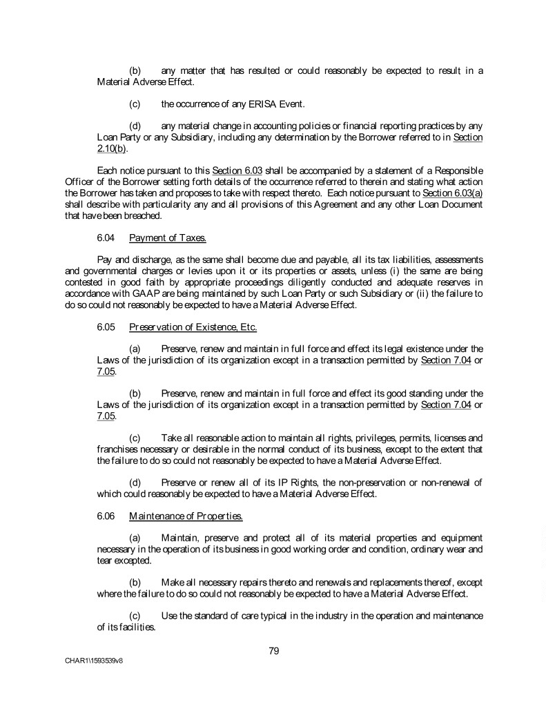 (b) any matter that has resulted or could reasonably be expected to result in a Material Adverse Effect. (c) the occurrence of any ERISA Event. (d) any material change in accounting policies or financial reporting practices by any Loan Party or any Subsidiary, including any determination by the Borrower referred to in Section 2.10(b). Each notice pursuant to this Section 6.03 shall be accompanied by a statement of a Responsible Officer of the Borrower setting forth details of the occurrence referred to therein and stating what action the Borrower has taken and proposes to take with respect thereto. Each notice pursuant to Section 6.03(a) shall describe with particularity any and all provisions of this Agreement and any other Loan Document that have been breached. 6.04 Payment of Taxes. Pay and discharge, as the same shall become due and payable, all its tax liabilities, assessments and governmental charges or levies upon it or its properties or assets, unless (i) the same are being contested in good faith by appropriate proceedings diligently conducted and adequate reserves in accordance with GAAP are being maintained by such Loan Party or such Subsidiary or (ii) the failure to do so could not reasonably be expected to have a Material Adverse Effect. 6.05 Preservation of Existence, Etc. (a) Preserve, renew and maintain in full force and effect its legal existence under the Laws of the jurisdiction of its organization except in a transaction permitted by Section 7.04 or 7.05. (b) Preserve, renew and maintain in full force and effect its good standing under the Laws of the jurisdiction of its organization except in a transaction permitted by Section 7.04 or 7.05. (c) Take all reasonable action to maintain all rights, privileges, permits, licenses and franchises necessary or desirable in the normal conduct of its business, except to the extent that the failure to do so could not reasonably be expected to have a Material Adverse Effect. (d) Preserve or renew all of its IP Rights, the non-preservation or non-renewal of which could reasonably be expected to have a Material Adverse Effect. 6.06 Maintenance of Properties. (a) Maintain, preserve and protect all of its material properties and equipment necessary in the operation of its business in good working order and condition, ordinary wear and tear excepted. (b) Make all necessary repairs thereto and renewals and replacements thereof, except where the failure to do so could not reasonably be expected to have a Material Adverse Effect. (c) Use the standard of care typical in the industry in the operation and maintenance of its facilities. 79 CHAR1\1593539v8