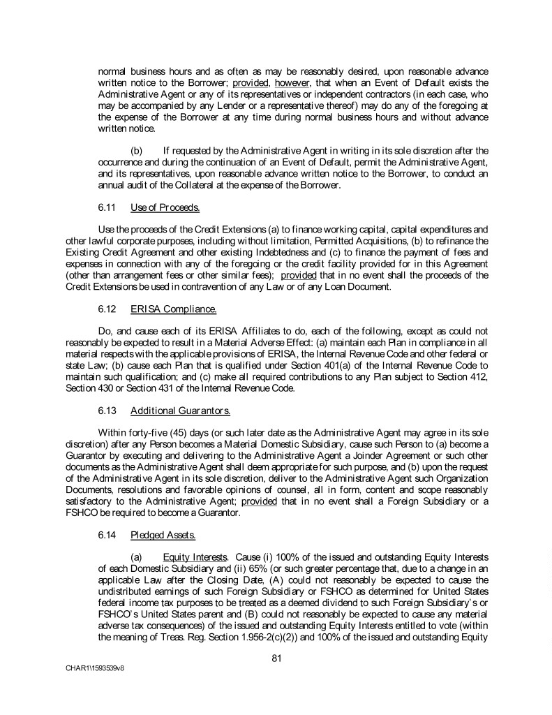 normal business hours and as often as may be reasonably desired, upon reasonable advance written notice to the Borrower; provided, however, that when an Event of Default exists the Administrative Agent or any of its representatives or independent contractors (in each case, who may be accompanied by any Lender or a representative thereof) may do any of the foregoing at the expense of the Borrower at any time during normal business hours and without advance written notice. (b) If requested by the Administrative Agent in writing in its sole discretion after the occurrence and during the continuation of an Event of Default, permit the Administrative Agent, and its representatives, upon reasonable advance written notice to the Borrower, to conduct an annual audit of the Collateral at the expense of the Borrower. 6.11 Use of Proceeds. Use the proceeds of the Credit Extensions (a) to finance working capital, capital expenditures and other lawful corporate purposes, including without limitation, Permitted Acquisitions, (b) to refinance the Existing Credit Agreement and other existing Indebtedness and (c) to finance the payment of fees and expenses in connection with any of the foregoing or the credit facility provided for in this Agreement (other than arrangement fees or other similar fees); provided that in no event shall the proceeds of the Credit Extensions be used in contravention of any Law or of any Loan Document. 6.12 ERISA Compliance. Do, and cause each of its ERISA Affiliates to do, each of the following, except as could not reasonably be expected to result in a Material Adverse Effect: (a) maintain each Plan in compliance in all material respects with the applicable provisions of ERISA, the Internal Revenue Code and other federal or state Law; (b) cause each Plan that is qualified under Section 401(a) of the Internal Revenue Code to maintain such qualification; and (c) make all required contributions to any Plan subject to Section 412, Section 430 or Section 431 of the Internal Revenue Code. 6.13 Additional Guarantors. Within forty-five (45) days (or such later date as the Administrative Agent may agree in its sole discretion) after any Person becomes a Material Domestic Subsidiary, cause such Person to (a) become a Guarantor by executing and delivering to the Administrative Agent a Joinder Agreement or such other documents as the Administrative Agent shall deem appropriate for such purpose, and (b) upon the request of the Administrative Agent in its sole discretion, deliver to the Administrative Agent such Organization Documents, resolutions and favorable opinions of counsel, all in form, content and scope reasonably satisfactory to the Administrative Agent; provided that in no event shall a Foreign Subsidiary or a FSHCO be required to become a Guarantor. 6.14 Pledged Assets. (a) Equity Interests. Cause (i) 100% of the issued and outstanding Equity Interests of each Domestic Subsidiary and (ii) 65% (or such greater percentage that, due to a change in an applicable Law after the Closing Date, (A) could not reasonably be expected to cause the undistributed earnings of such Foreign Subsidiary or FSHCO as determined for United States federal income tax purposes to be treated as a deemed dividend to such Foreign Subsidiary’s or FSHCO’s United States parent and (B) could not reasonably be expected to cause any material adverse tax consequences) of the issued and outstanding Equity Interests entitled to vote (within the meaning of Treas. Reg. Section 1.956-2(c)(2)) and 100% of the issued and outstanding Equity 81 CHAR1\1593539v8