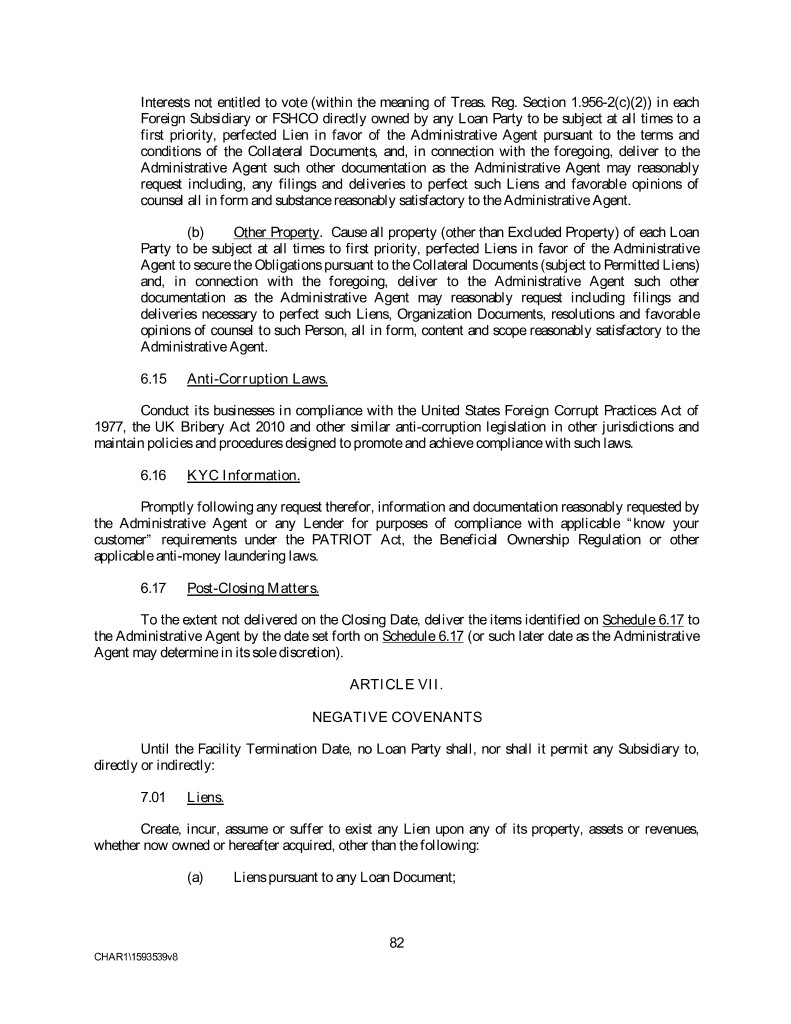 Interests not entitled to vote (within the meaning of Treas. Reg. Section 1.956-2(c)(2)) in each Foreign Subsidiary or FSHCO directly owned by any Loan Party to be subject at all times to a first priority, perfected Lien in favor of the Administrative Agent pursuant to the terms and conditions of the Collateral Documents, and, in connection with the foregoing, deliver to the Administrative Agent such other documentation as the Administrative Agent may reasonably request including, any filings and deliveries to perfect such Liens and favorable opinions of counsel all in form and substance reasonably satisfactory to the Administrative Agent. (b) Other Property. Cause all property (other than Excluded Property) of each Loan Party to be subject at all times to first priority, perfected Liens in favor of the Administrative Agent to secure the Obligations pursuant to the Collateral Documents (subject to Permitted Liens) and, in connection with the foregoing, deliver to the Administrative Agent such other documentation as the Administrative Agent may reasonably request including filings and deliveries necessary to perfect such Liens, Organization Documents, resolutions and favorable opinions of counsel to such Person, all in form, content and scope reasonably satisfactory to the Administrative Agent. 6.15 Anti-Corruption Laws. Conduct its businesses in compliance with the United States Foreign Corrupt Practices Act of 1977, the UK Bribery Act 2010 and other similar anti-corruption legislation in other jurisdictions and maintain policies and procedures designed to promote and achieve compliance with such laws. 6.16 KYC Information. Promptly following any request therefor, information and documentation reasonably requested by the Administrative Agent or any Lender for purposes of compliance with applicable “know your customer” requirements under the PATRIOT Act, the Beneficial Ownership Regulation or other applicable anti-money laundering laws. 6.17 Post-Closing Matters. To the extent not delivered on the Closing Date, deliver the items identified on Schedule 6.17 to the Administrative Agent by the date set forth on Schedule 6.17 (or such later date as the Administrative Agent may determine in its sole discretion). ARTICLE VII. NEGATIVE COVENANTS Until the Facility Termination Date, no Loan Party shall, nor shall it permit any Subsidiary to, directly or indirectly: 7.01 Liens. Create, incur, assume or suffer to exist any Lien upon any of its property, assets or revenues, whether now owned or hereafter acquired, other than the following: (a) Liens pursuant to any Loan Document; 82 CHAR1\1593539v8