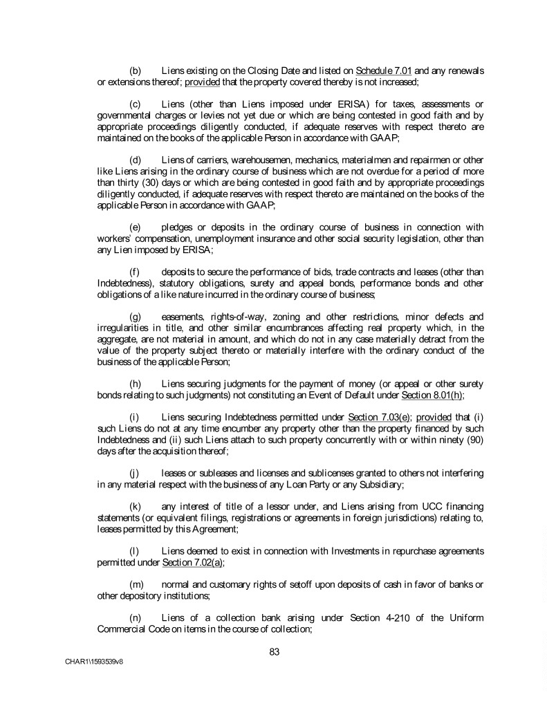 (b) Liens existing on the Closing Date and listed on Schedule 7.01 and any renewals or extensions thereof; provided that the property covered thereby is not increased; (c) Liens (other than Liens imposed under ERISA) for taxes, assessments or governmental charges or levies not yet due or which are being contested in good faith and by appropriate proceedings diligently conducted, if adequate reserves with respect thereto are maintained on the books of the applicable Person in accordance with GAAP; (d) Liens of carriers, warehousemen, mechanics, materialmen and repairmen or other like Liens arising in the ordinary course of business which are not overdue for a period of more than thirty (30) days or which are being contested in good faith and by appropriate proceedings diligently conducted, if adequate reserves with respect thereto are maintained on the books of the applicable Person in accordance with GAAP; (e) pledges or deposits in the ordinary course of business in connection with workers’ compensation, unemployment insurance and other social security legislation, other than any Lien imposed by ERISA; (f) deposits to secure the performance of bids, trade contracts and leases (other than Indebtedness), statutory obligations, surety and appeal bonds, performance bonds and other obligations of a like nature incurred in the ordinary course of business; (g) easements, rights-of-way, zoning and other restrictions, minor defects and irregularities in title, and other similar encumbrances affecting real property which, in the aggregate, are not material in amount, and which do not in any case materially detract from the value of the property subject thereto or materially interfere with the ordinary conduct of the business of the applicable Person; (h) Liens securing judgments for the payment of money (or appeal or other surety bonds relating to such judgments) not constituting an Event of Default under Section 8.01(h); (i) Liens securing Indebtedness permitted under Section 7.03(e); provided that (i) such Liens do not at any time encumber any property other than the property financed by such Indebtedness and (ii) such Liens attach to such property concurrently with or within ninety (90) days after the acquisition thereof; (j) leases or subleases and licenses and sublicenses granted to others not interfering in any material respect with the business of any Loan Party or any Subsidiary; (k) any interest of title of a lessor under, and Liens arising from UCC financing statements (or equivalent filings, registrations or agreements in foreign jurisdictions) relating to, leases permitted by this Agreement; (l) Liens deemed to exist in connection with Investments in repurchase agreements permitted under Section 7.02(a); (m) normal and customary rights of setoff upon deposits of cash in favor of banks or other depository institutions; (n) Liens of a collection bank arising under Section 4-210 of the Uniform Commercial Code on items in the course of collection; 83 CHAR1\1593539v8