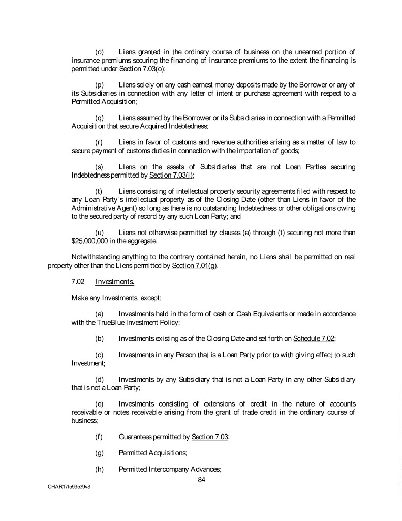 (o) Liens granted in the ordinary course of business on the unearned portion of insurance premiums securing the financing of insurance premiums to the extent the financing is permitted under Section 7.03(o); (p) Liens solely on any cash earnest money deposits made by the Borrower or any of its Subsidiaries in connection with any letter of intent or purchase agreement with respect to a Permitted Acquisition; (q) Liens assumed by the Borrower or its Subsidiaries in connection with a Permitted Acquisition that secure Acquired Indebtedness; (r) Liens in favor of customs and revenue authorities arising as a matter of law to secure payment of customs duties in connection with the importation of goods; (s) Liens on the assets of Subsidiaries that are not Loan Parties securing Indebtedness permitted by Section 7.03(j); (t) Liens consisting of intellectual property security agreements filed with respect to any Loan Party’s intellectual property as of the Closing Date (other than Liens in favor of the Administrative Agent) so long as there is no outstanding Indebtedness or other obligations owing to the secured party of record by any such Loan Party; and (u) Liens not otherwise permitted by clauses (a) through (t) securing not more than $25,000,000 in the aggregate. Notwithstanding anything to the contrary contained herein, no Liens shall be permitted on real property other than the Liens permitted by Section 7.01(g). 7.02 Investments. Make any Investments, except: (a) Investments held in the form of cash or Cash Equivalents or made in accordance with the TrueBlue Investment Policy; (b) Investments existing as of the Closing Date and set forth on Schedule 7.02; (c) Investments in any Person that is a Loan Party prior to with giving effect to such Investment; (d) Investments by any Subsidiary that is not a Loan Party in any other Subsidiary that is not a Loan Party; (e) Investments consisting of extensions of credit in the nature of accounts receivable or notes receivable arising from the grant of trade credit in the ordinary course of business; (f) Guarantees permitted by Section 7.03; (g) Permitted Acquisitions; (h) Permitted Intercompany Advances; 84 CHAR1\1593539v8
