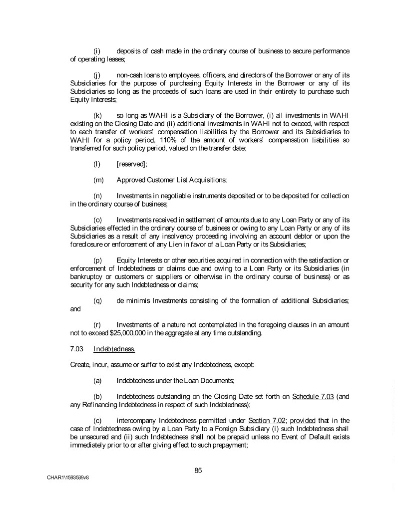 (i) deposits of cash made in the ordinary course of business to secure performance of operating leases; (j) non-cash loans to employees, officers, and directors of the Borrower or any of its Subsidiaries for the purpose of purchasing Equity Interests in the Borrower or any of its Subsidiaries so long as the proceeds of such loans are used in their entirety to purchase such Equity Interests; (k) so long as WAHI is a Subsidiary of the Borrower, (i) all investments in WAHI existing on the Closing Date and (ii) additional investments in WAHI not to exceed, with respect to each transfer of workers’ compensation liabilities by the Borrower and its Subsidiaries to WAHI for a policy period, 110% of the amount of workers’ compensation liabilities so transferred for such policy period, valued on the transfer date; (l) [reserved]; (m) Approved Customer List Acquisitions; (n) Investments in negotiable instruments deposited or to be deposited for collection in the ordinary course of business; (o) Investments received in settlement of amounts due to any Loan Party or any of its Subsidiaries effected in the ordinary course of business or owing to any Loan Party or any of its Subsidiaries as a result of any insolvency proceeding involving an account debtor or upon the foreclosure or enforcement of any Lien in favor of a Loan Party or its Subsidiaries; (p) Equity Interests or other securities acquired in connection with the satisfaction or enforcement of Indebtedness or claims due and owing to a Loan Party or its Subsidiaries (in bankruptcy or customers or suppliers or otherwise in the ordinary course of business) or as security for any such Indebtedness or claims; (q) de minimis Investments consisting of the formation of additional Subsidiaries; and (r) Investments of a nature not contemplated in the foregoing clauses in an amount not to exceed $25,000,000 in the aggregate at any time outstanding. 7.03 Indebtedness. Create, incur, assume or suffer to exist any Indebtedness, except: (a) Indebtedness under the Loan Documents; (b) Indebtedness outstanding on the Closing Date set forth on Schedule 7.03 (and any Refinancing Indebtedness in respect of such Indebtedness); (c) intercompany Indebtedness permitted under Section 7.02; provided that in the case of Indebtedness owing by a Loan Party to a Foreign Subsidiary (i) such Indebtedness shall be unsecured and (ii) such Indebtedness shall not be prepaid unless no Event of Default exists immediately prior to or after giving effect to such prepayment; 85 CHAR1\1593539v8