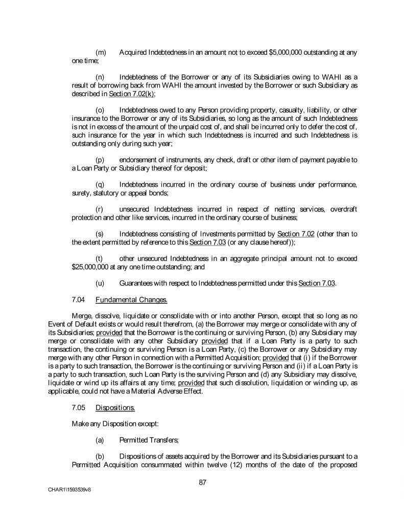 (m) Acquired Indebtedness in an amount not to exceed $5,000,000 outstanding at any one time; (n) Indebtedness of the Borrower or any of its Subsidiaries owing to WAHI as a result of borrowing back from WAHI the amount invested by the Borrower or such Subsidiary as described in Section 7.02(k); (o) Indebtedness owed to any Person providing property, casualty, liability, or other insurance to the Borrower or any of its Subsidiaries, so long as the amount of such Indebtedness is not in excess of the amount of the unpaid cost of, and shall be incurred only to defer the cost of, such insurance for the year in which such Indebtedness is incurred and such Indebtedness is outstanding only during such year; (p) endorsement of instruments, any check, draft or other item of payment payable to a Loan Party or Subsidiary thereof for deposit; (q) Indebtedness incurred in the ordinary course of business under performance, surety, statutory or appeal bonds; (r) unsecured Indebtedness incurred in respect of netting services, overdraft protection and other like services, incurred in the ordinary course of business; (s) Indebtedness consisting of Investments permitted by Section 7.02 (other than to the extent permitted by reference to this Section 7.03 (or any clause hereof)); (t) other unsecured Indebtedness in an aggregate principal amount not to exceed $25,000,000 at any one time outstanding; and (u) Guarantees with respect to Indebtedness permitted under this Section 7.03. 7.04 Fundamental Changes. Merge, dissolve, liquidate or consolidate with or into another Person, except that so long as no Event of Default exists or would result therefrom, (a) the Borrower may merge or consolidate with any of its Subsidiaries; provided that the Borrower is the continuing or surviving Person, (b) any Subsidiary may merge or consolidate with any other Subsidiary provided that if a Loan Party is a party to such transaction, the continuing or surviving Person is a Loan Party, (c) the Borrower or any Subsidiary may merge with any other Person in connection with a Permitted Acquisition; provided that (i) if the Borrower is a party to such transaction, the Borrower is the continuing or surviving Person and (ii) if a Loan Party is a party to such transaction, such Loan Party is the surviving Person and (d) any Subsidiary may dissolve, liquidate or wind up its affairs at any time; provided that such dissolution, liquidation or winding up, as applicable, could not have a Material Adverse Effect. 7.05 Dispositions. Make any Disposition except: (a) Permitted Transfers; (b) Dispositions of assets acquired by the Borrower and its Subsidiaries pursuant to a Permitted Acquisition consummated within twelve (12) months of the date of the proposed 87 CHAR1\1593539v8
