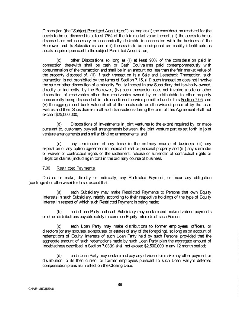 Disposition (the “Subject Permitted Acquisition”) so long as (i) the consideration received for the assets to be so disposed is at least 75% of the fair market value thereof, (ii) the assets to be so disposed are not necessary or economically desirable in connection with the business of the Borrower and its Subsidiaries, and (iii) the assets to be so disposed are readily identifiable as assets acquired pursuant to the subject Permitted Acquisition; (c) other Dispositions so long as (i) at least 90% of the consideration paid in connection therewith shall be cash or Cash Equivalents paid contemporaneously with consummation of the transaction and shall be in an amount not less than the fair market value of the property disposed of, (ii) if such transaction is a Sale and Leaseback Transaction, such transaction is not prohibited by the terms of Section 7.15, (iii) such transaction does not involve the sale or other disposition of a minority Equity Interest in any Subsidiary that is wholly-owned, directly or indirectly, by the Borrower, (iv) such transaction does not involve a sale or other disposition of receivables other than receivables owned by or attributable to other property concurrently being disposed of in a transaction otherwise permitted under this Section 7.05, and (v) the aggregate net book value of all of the assets sold or otherwise disposed of by the Loan Parties and their Subsidiaries in all such transactions during the term of this Agreement shall not exceed $25,000,000; (d) Dispositions of Investments in joint ventures to the extent required by, or made pursuant to, customary buy/sell arrangements between, the joint venture parties set forth in joint venture arrangements and similar binding arrangements; and (e) any termination of any lease in the ordinary course of business, (ii) any expiration of any option agreement in respect of real or personal property and (iii) any surrender or waiver of contractual rights or the settlement, release or surrender of contractual rights or litigation claims (including in tort) in the ordinary course of business. 7.06 Restricted Payments. Declare or make, directly or indirectly, any Restricted Payment, or incur any obligation (contingent or otherwise) to do so, except that: (a) each Subsidiary may make Restricted Payments to Persons that own Equity Interests in such Subsidiary, ratably according to their respective holdings of the type of Equity Interest in respect of which such Restricted Payment is being made; (b) each Loan Party and each Subsidiary may declare and make dividend payments or other distributions payable solely in common Equity Interests of such Person; (c) each Loan Party may make distributions to former employees, officers, or directors (or any spouses, ex-spouses, or estates of any of the foregoing), so long as on account of redemptions of Equity Interests of such Loan Party held by such Persons, provided that the aggregate amount of such redemptions made by such Loan Party plus the aggregate amount of Indebtedness described in Section 7.03(k) shall not exceed $2,500,000 in any 12 month period; (d) each Loan Party may declare and pay any dividend or make any other payment or distribution to its then current or former employees pursuant to such Loan Party’s deferred compensation plans as in effect on the Closing Date; 88 CHAR1\1593539v8