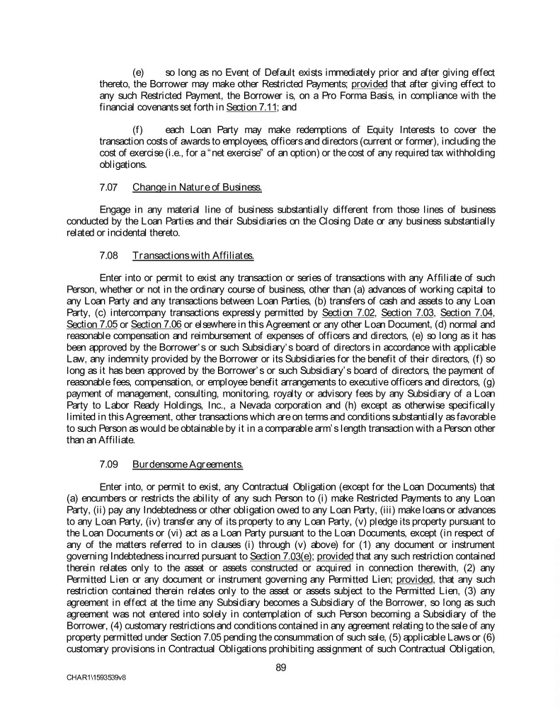 (e) so long as no Event of Default exists immediately prior and after giving effect thereto, the Borrower may make other Restricted Payments; provided that after giving effect to any such Restricted Payment, the Borrower is, on a Pro Forma Basis, in compliance with the financial covenants set forth in Section 7.11; and (f) each Loan Party may make redemptions of Equity Interests to cover the transaction costs of awards to employees, officers and directors (current or former), including the cost of exercise (i.e., for a “net exercise” of an option) or the cost of any required tax withholding obligations. 7.07 Change in Nature of Business. Engage in any material line of business substantially different from those lines of business conducted by the Loan Parties and their Subsidiaries on the Closing Date or any business substantially related or incidental thereto. 7.08 Transactions with Affiliates. Enter into or permit to exist any transaction or series of transactions with any Affiliate of such Person, whether or not in the ordinary course of business, other than (a) advances of working capital to any Loan Party and any transactions between Loan Parties, (b) transfers of cash and assets to any Loan Party, (c) intercompany transactions expressly permitted by Section 7.02, Section 7.03, Section 7.04, Section 7.05 or Section 7.06 or elsewhere in this Agreement or any other Loan Document, (d) normal and reasonable compensation and reimbursement of expenses of officers and directors, (e) so long as it has been approved by the Borrower’s or such Subsidiary’s board of directors in accordance with applicable Law, any indemnity provided by the Borrower or its Subsidiaries for the benefit of their directors, (f) so long as it has been approved by the Borrower’s or such Subsidiary’s board of directors, the payment of reasonable fees, compensation, or employee benefit arrangements to executive officers and directors, (g) payment of management, consulting, monitoring, royalty or advisory fees by any Subsidiary of a Loan Party to Labor Ready Holdings, Inc., a Nevada corporation and (h) except as otherwise specifically limited in this Agreement, other transactions which are on terms and conditions substantially as favorable to such Person as would be obtainable by it in a comparable arm’s length transaction with a Person other than an Affiliate. 7.09 Burdensome Agreements. Enter into, or permit to exist, any Contractual Obligation (except for the Loan Documents) that (a) encumbers or restricts the ability of any such Person to (i) make Restricted Payments to any Loan Party, (ii) pay any Indebtedness or other obligation owed to any Loan Party, (iii) make loans or advances to any Loan Party, (iv) transfer any of its property to any Loan Party, (v) pledge its property pursuant to the Loan Documents or (vi) act as a Loan Party pursuant to the Loan Documents, except (in respect of any of the matters referred to in clauses (i) through (v) above) for (1) any document or instrument governing Indebtedness incurred pursuant to Section 7.03(e); provided that any such restriction contained therein relates only to the asset or assets constructed or acquired in connection therewith, (2) any Permitted Lien or any document or instrument governing any Permitted Lien; provided, that any such restriction contained therein relates only to the asset or assets subject to the Permitted Lien, (3) any agreement in effect at the time any Subsidiary becomes a Subsidiary of the Borrower, so long as such agreement was not entered into solely in contemplation of such Person becoming a Subsidiary of the Borrower, (4) customary restrictions and conditions contained in any agreement relating to the sale of any property permitted under Section 7.05 pending the consummation of such sale, (5) applicable Laws or (6) customary provisions in Contractual Obligations prohibiting assignment of such Contractual Obligation, 89 CHAR1\1593539v8