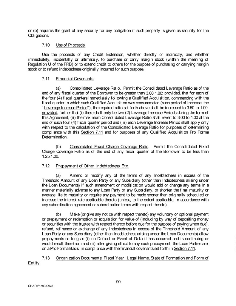 or (b) requires the grant of any security for any obligation if such property is given as security for the Obligations. 7.10 Use of Proceeds. Use the proceeds of any Credit Extension, whether directly or indirectly, and whether immediately, incidentally or ultimately, to purchase or carry margin stock (within the meaning of Regulation U of the FRB) or to extend credit to others for the purpose of purchasing or carrying margin stock or to refund indebtedness originally incurred for such purpose. 7.11 Financial Covenants. (a) Consolidated Leverage Ratio. Permit the Consolidated Leverage Ratio as of the end of any fiscal quarter of the Borrower to be greater than 3.00:1.00; provided, that for each of the four (4) fiscal quarters immediately following a Qualified Acquisition, commencing with the fiscal quarter in which such Qualified Acquisition was consummated (such period of increase, the “Leverage Increase Period”), the required ratio set forth above shall be increased to 3.50 to 1.00; provided, further that (i) there shall only be two (2) Leverage Increase Periods during the term of this Agreement, (ii) the maximum Consolidated Leverage Ratio shall revert to 3.00 to 1.00 at the end of such four (4) fiscal quarter period and (iii) each Leverage Increase Period shall apply only with respect to the calculation of the Consolidated Leverage Ratio for purposes of determining compliance with this Section 7.11 and for purposes of any Qualified Acquisition Pro Forma Determination. (b) Consolidated Fixed Charge Coverage Ratio. Permit the Consolidated Fixed Charge Coverage Ratio as of the end of any fiscal quarter of the Borrower to be less than 1.25:1.00. 7.12 Prepayment of Other Indebtedness, Etc. (a) Amend or modify any of the terms of any Indebtedness in excess of the Threshold Amount of any Loan Party or any Subsidiary (other than Indebtedness arising under the Loan Documents) if such amendment or modification would add or change any terms in a manner materially adverse to any Loan Party or any Subsidiary, or shorten the final maturity or average life to maturity or require any payment to be made sooner than originally scheduled or increase the interest rate applicable thereto (unless, to the extent applicable, in accordance with any subordination agreement or subordination terms with respect thereto). (b) Make (or give any notice with respect thereto) any voluntary or optional payment or prepayment or redemption or acquisition for value of (including by way of depositing money or securities with the trustee with respect thereto before due for the purpose of paying when due), refund, refinance or exchange of any Indebtedness in excess of the Threshold Amount of any Loan Party or any Subsidiary (other than Indebtedness arising under the Loan Documents) allow prepayments so long as (i) no Default or Event of Default has occurred and is continuing or would result therefrom and (ii) after giving effect to any such prepayment, the Loan Parties are, on a Pro Forma Basis, in compliance with the financial covenants set forth in Section 7.11. 7.13 Organization Documents; Fiscal Year; Legal Name, State of Formation and Form of Entity. 90 CHAR1\1593539v8