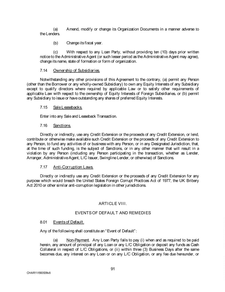 (a) Amend, modify or change its Organization Documents in a manner adverse to the Lenders. (b) Change its fiscal year. (c) With respect to any Loan Party, without providing ten (10) days prior written notice to the Administrative Agent (or such lesser period as the Administrative Agent may agree), change its name, state of formation or form of organization. 7.14 Ownership of Subsidiaries. Notwithstanding any other provisions of this Agreement to the contrary, (a) permit any Person (other than the Borrower or any wholly-owned Subsidiary) to own any Equity Interests of any Subsidiary except to qualify directors where required by applicable Law or to satisfy other requirements of applicable Law with respect to the ownership of Equity Interests of Foreign Subsidiaries, or (b) permit any Subsidiary to issue or have outstanding any shares of preferred Equity Interests. 7.15 Sale Leasebacks. Enter into any Sale and Leaseback Transaction. 7.16 Sanctions. Directly or indirectly, use any Credit Extension or the proceeds of any Credit Extension, or lend, contribute or otherwise make available such Credit Extension or the proceeds of any Credit Extension to any Person, to fund any activities of or business with any Person, or in any Designated Jurisdiction, that, at the time of such funding, is the subject of Sanctions, or in any other manner that will result in a violation by any Person (including any Person participating in the transaction, whether as Lender, Arranger, Administrative Agent, L/C Issuer, Swingline Lender, or otherwise) of Sanctions. 7.17 Anti-Corruption Laws. Directly or indirectly use any Credit Extension or the proceeds of any Credit Extension for any purpose which would breach the United States Foreign Corrupt Practices Act of 1977, the UK Bribery Act 2010 or other similar anti-corruption legislation in other jurisdictions. ARTICLE VIII. EVENTS OF DEFAULT AND REMEDIES 8.01 Events of Default. Any of the following shall constitute an “Event of Default”: (a) Non-Payment. Any Loan Party fails to pay (i) when and as required to be paid herein, any amount of principal of any Loan or any L/C Obligation or deposit any funds as Cash Collateral in respect of L/C Obligations, or (ii) within three (3) Business Days after the same becomes due, any interest on any Loan or on any L/C Obligation, or any fee due hereunder, or 91 CHAR1\1593539v8