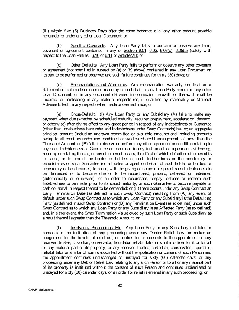 (iii) within five (5) Business Days after the same becomes due, any other amount payable hereunder or under any other Loan Document; or (b) Specific Covenants. Any Loan Party fails to perform or observe any term, covenant or agreement contained in any of Section 6.01, 6.02, 6.03(a), 6.05(a) (solely with respect to the Loan Parties), 6.10 or 6.11 or Article VII; or (c) Other Defaults. Any Loan Party fails to perform or observe any other covenant or agreement (not specified in subsection (a) or (b) above) contained in any Loan Document on its part to be performed or observed and such failure continues for thirty (30) days; or (d) Representations and Warranties. Any representation, warranty, certification or statement of fact made or deemed made by or on behalf of any Loan Party herein, in any other Loan Document, or in any document delivered in connection herewith or therewith shall be incorrect or misleading in any material respects (or, if qualified by materiality or Material Adverse Effect, in any respect) when made or deemed made; or (e) Cross-Default. (i) Any Loan Party or any Subsidiary (A) fails to make any payment when due (whether by scheduled maturity, required prepayment, acceleration, demand, or otherwise) after giving effect to any grace period in respect of any Indebtedness or Guarantee (other than Indebtedness hereunder and Indebtedness under Swap Contracts) having an aggregate principal amount (including undrawn committed or available amounts and including amounts owing to all creditors under any combined or syndicated credit arrangement) of more than the Threshold Amount, or (B) fails to observe or perform any other agreement or condition relating to any such Indebtedness or Guarantee or contained in any instrument or agreement evidencing, securing or relating thereto, or any other event occurs, the effect of which default or other event is to cause, or to permit the holder or holders of such Indebtedness or the beneficiary or beneficiaries of such Guarantee (or a trustee or agent on behalf of such holder or holders or beneficiary or beneficiaries) to cause, with the giving of notice if required, such Indebtedness to be demanded or to become due or to be repurchased, prepaid, defeased or redeemed (automatically or otherwise), or an offer to repurchase, prepay, defease or redeem such Indebtedness to be made, prior to its stated maturity, or such Guarantee to become payable or cash collateral in respect thereof to be demanded; or (ii) there occurs under any Swap Contract an Early Termination Date (as defined in such Swap Contract) resulting from (A) any event of default under such Swap Contract as to which any Loan Party or any Subsidiary is the Defaulting Party (as defined in such Swap Contract) or (B) any Termination Event (as so defined) under such Swap Contract as to which any Loan Party or any Subsidiary is an Affected Party (as so defined) and, in either event, the Swap Termination Value owed by such Loan Party or such Subsidiary as a result thereof is greater than the Threshold Amount; or (f) Insolvency Proceedings, Etc. Any Loan Party or any Subsidiary institutes or consents to the institution of any proceeding under any Debtor Relief Law, or makes an assignment for the benefit of creditors; or applies for or consents to the appointment of any receiver, trustee, custodian, conservator, liquidator, rehabilitator or similar officer for it or for all or any material part of its property; or any receiver, trustee, custodian, conservator, liquidator, rehabilitator or similar officer is appointed without the application or consent of such Person and the appointment continues undischarged or unstayed for sixty (60) calendar days; or any proceeding under any Debtor Relief Law relating to any such Person or to all or any material part of its property is instituted without the consent of such Person and continues undismissed or unstayed for sixty (60) calendar days, or an order for relief is entered in any such proceeding; or 92 CHAR1\1593539v8