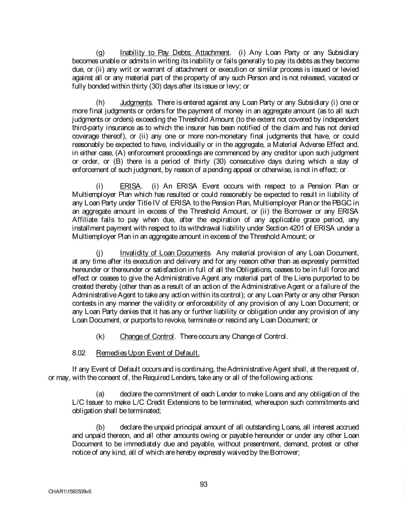 (g) Inability to Pay Debts; Attachment. (i) Any Loan Party or any Subsidiary becomes unable or admits in writing its inability or fails generally to pay its debts as they become due, or (ii) any writ or warrant of attachment or execution or similar process is issued or levied against all or any material part of the property of any such Person and is not released, vacated or fully bonded within thirty (30) days after its issue or levy; or (h) Judgments. There is entered against any Loan Party or any Subsidiary (i) one or more final judgments or orders for the payment of money in an aggregate amount (as to all such judgments or orders) exceeding the Threshold Amount (to the extent not covered by independent third-party insurance as to which the insurer has been notified of the claim and has not denied coverage thereof), or (ii) any one or more non-monetary final judgments that have, or could reasonably be expected to have, individually or in the aggregate, a Material Adverse Effect and, in either case, (A) enforcement proceedings are commenced by any creditor upon such judgment or order, or (B) there is a period of thirty (30) consecutive days during which a stay of enforcement of such judgment, by reason of a pending appeal or otherwise, is not in effect; or (i) ERISA. (i) An ERISA Event occurs with respect to a Pension Plan or Multiemployer Plan which has resulted or could reasonably be expected to result in liability of any Loan Party under Title IV of ERISA to the Pension Plan, Multiemployer Plan or the PBGC in an aggregate amount in excess of the Threshold Amount, or (ii) the Borrower or any ERISA Affiliate fails to pay when due, after the expiration of any applicable grace period, any installment payment with respect to its withdrawal liability under Section 4201 of ERISA under a Multiemployer Plan in an aggregate amount in excess of the Threshold Amount; or (j) Invalidity of Loan Documents. Any material provision of any Loan Document, at any time after its execution and delivery and for any reason other than as expressly permitted hereunder or thereunder or satisfaction in full of all the Obligations, ceases to be in full force and effect or ceases to give the Administrative Agent any material part of the Liens purported to be created thereby (other than as a result of an action of the Administrative Agent or a failure of the Administrative Agent to take any action within its control); or any Loan Party or any other Person contests in any manner the validity or enforceability of any provision of any Loan Document; or any Loan Party denies that it has any or further liability or obligation under any provision of any Loan Document, or purports to revoke, terminate or rescind any Loan Document; or (k) Change of Control. There occurs any Change of Control. 8.02 Remedies Upon Event of Default. If any Event of Default occurs and is continuing, the Administrative Agent shall, at the request of, or may, with the consent of, the Required Lenders, take any or all of the following actions: (a) declare the commitment of each Lender to make Loans and any obligation of the L/C Issuer to make L/C Credit Extensions to be terminated, whereupon such commitments and obligation shall be terminated; (b) declare the unpaid principal amount of all outstanding Loans, all interest accrued and unpaid thereon, and all other amounts owing or payable hereunder or under any other Loan Document to be immediately due and payable, without presentment, demand, protest or other notice of any kind, all of which are hereby expressly waived by the Borrower; 93 CHAR1\1593539v8