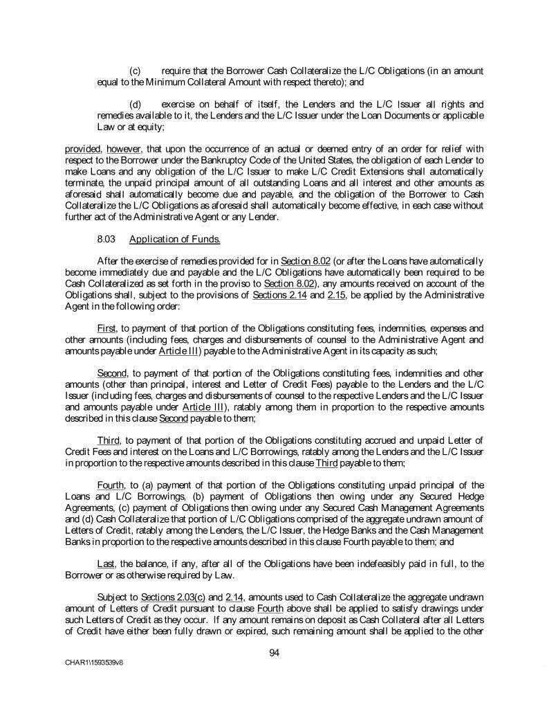 (c) require that the Borrower Cash Collateralize the L/C Obligations (in an amount equal to the Minimum Collateral Amount with respect thereto); and (d) exercise on behalf of itself, the Lenders and the L/C Issuer all rights and remedies available to it, the Lenders and the L/C Issuer under the Loan Documents or applicable Law or at equity; provided, however, that upon the occurrence of an actual or deemed entry of an order for relief with respect to the Borrower under the Bankruptcy Code of the United States, the obligation of each Lender to make Loans and any obligation of the L/C Issuer to make L/C Credit Extensions shall automatically terminate, the unpaid principal amount of all outstanding Loans and all interest and other amounts as aforesaid shall automatically become due and payable, and the obligation of the Borrower to Cash Collateralize the L/C Obligations as aforesaid shall automatically become effective, in each case without further act of the Administrative Agent or any Lender. 8.03 Application of Funds. After the exercise of remedies provided for in Section 8.02 (or after the Loans have automatically become immediately due and payable and the L/C Obligations have automatically been required to be Cash Collateralized as set forth in the proviso to Section 8.02), any amounts received on account of the Obligations shall, subject to the provisions of Sections 2.14 and 2.15, be applied by the Administrative Agent in the following order: First, to payment of that portion of the Obligations constituting fees, indemnities, expenses and other amounts (including fees, charges and disbursements of counsel to the Administrative Agent and amounts payable under Article III) payable to the Administrative Agent in its capacity as such; Second, to payment of that portion of the Obligations constituting fees, indemnities and other amounts (other than principal, interest and Letter of Credit Fees) payable to the Lenders and the L/C Issuer (including fees, charges and disbursements of counsel to the respective Lenders and the L/C Issuer and amounts payable under Article III), ratably among them in proportion to the respective amounts described in this clause Second payable to them; Third, to payment of that portion of the Obligations constituting accrued and unpaid Letter of Credit Fees and interest on the Loans and L/C Borrowings, ratably among the Lenders and the L/C Issuer in proportion to the respective amounts described in this clause Third payable to them; Fourth, to (a) payment of that portion of the Obligations constituting unpaid principal of the Loans and L/C Borrowings, (b) payment of Obligations then owing under any Secured Hedge Agreements, (c) payment of Obligations then owing under any Secured Cash Management Agreements and (d) Cash Collateralize that portion of L/C Obligations comprised of the aggregate undrawn amount of Letters of Credit, ratably among the Lenders, the L/C Issuer, the Hedge Banks and the Cash Management Banks in proportion to the respective amounts described in this clause Fourth payable to them; and Last, the balance, if any, after all of the Obligations have been indefeasibly paid in full, to the Borrower or as otherwise required by Law. Subject to Sections 2.03(c) and 2.14, amounts used to Cash Collateralize the aggregate undrawn amount of Letters of Credit pursuant to clause Fourth above shall be applied to satisfy drawings under such Letters of Credit as they occur. If any amount remains on deposit as Cash Collateral after all Letters of Credit have either been fully drawn or expired, such remaining amount shall be applied to the other 94 CHAR1\1593539v8