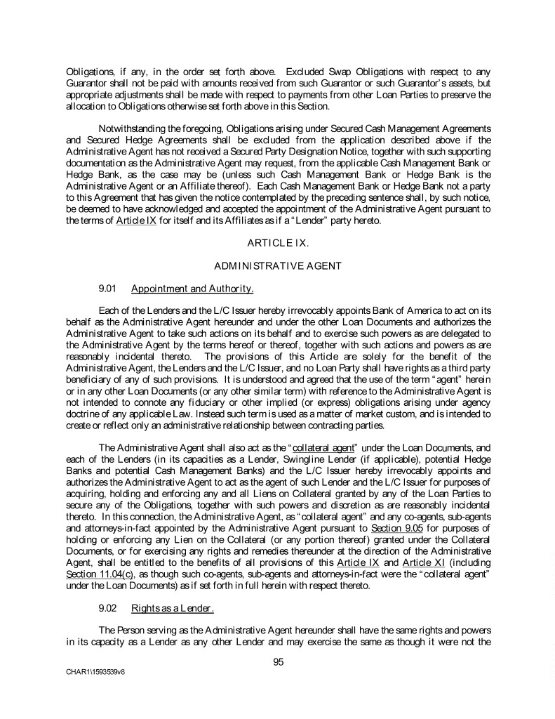 Obligations, if any, in the order set forth above. Excluded Swap Obligations with respect to any Guarantor shall not be paid with amounts received from such Guarantor or such Guarantor’s assets, but appropriate adjustments shall be made with respect to payments from other Loan Parties to preserve the allocation to Obligations otherwise set forth above in this Section. Notwithstanding the foregoing, Obligations arising under Secured Cash Management Agreements and Secured Hedge Agreements shall be excluded from the application described above if the Administrative Agent has not received a Secured Party Designation Notice, together with such supporting documentation as the Administrative Agent may request, from the applicable Cash Management Bank or Hedge Bank, as the case may be (unless such Cash Management Bank or Hedge Bank is the Administrative Agent or an Affiliate thereof). Each Cash Management Bank or Hedge Bank not a party to this Agreement that has given the notice contemplated by the preceding sentence shall, by such notice, be deemed to have acknowledged and accepted the appointment of the Administrative Agent pursuant to the terms of Article IX for itself and its Affiliates as if a “Lender” party hereto. ARTICLE IX. ADMINISTRATIVE AGENT 9.01 Appointment and Authority. Each of the Lenders and the L/C Issuer hereby irrevocably appoints Bank of America to act on its behalf as the Administrative Agent hereunder and under the other Loan Documents and authorizes the Administrative Agent to take such actions on its behalf and to exercise such powers as are delegated to the Administrative Agent by the terms hereof or thereof, together with such actions and powers as are reasonably incidental thereto. The provisions of this Article are solely for the benefit of the Administrative Agent, the Lenders and the L/C Issuer, and no Loan Party shall have rights as a third party beneficiary of any of such provisions. It is understood and agreed that the use of the term “agent” herein or in any other Loan Documents (or any other similar term) with reference to the Administrative Agent is not intended to connote any fiduciary or other implied (or express) obligations arising under agency doctrine of any applicable Law. Instead such term is used as a matter of market custom, and is intended to create or reflect only an administrative relationship between contracting parties. The Administrative Agent shall also act as the “collateral agent” under the Loan Documents, and each of the Lenders (in its capacities as a Lender, Swingline Lender (if applicable), potential Hedge Banks and potential Cash Management Banks) and the L/C Issuer hereby irrevocably appoints and authorizes the Administrative Agent to act as the agent of such Lender and the L/C Issuer for purposes of acquiring, holding and enforcing any and all Liens on Collateral granted by any of the Loan Parties to secure any of the Obligations, together with such powers and discretion as are reasonably incidental thereto. In this connection, the Administrative Agent, as “collateral agent” and any co-agents, sub-agents and attorneys-in-fact appointed by the Administrative Agent pursuant to Section 9.05 for purposes of holding or enforcing any Lien on the Collateral (or any portion thereof) granted under the Collateral Documents, or for exercising any rights and remedies thereunder at the direction of the Administrative Agent, shall be entitled to the benefits of all provisions of this Article IX and Article XI (including Section 11.04(c), as though such co-agents, sub-agents and attorneys-in-fact were the “collateral agent” under the Loan Documents) as if set forth in full herein with respect thereto. 9.02 Rights as a Lender. The Person serving as the Administrative Agent hereunder shall have the same rights and powers in its capacity as a Lender as any other Lender and may exercise the same as though it were not the 95 CHAR1\1593539v8