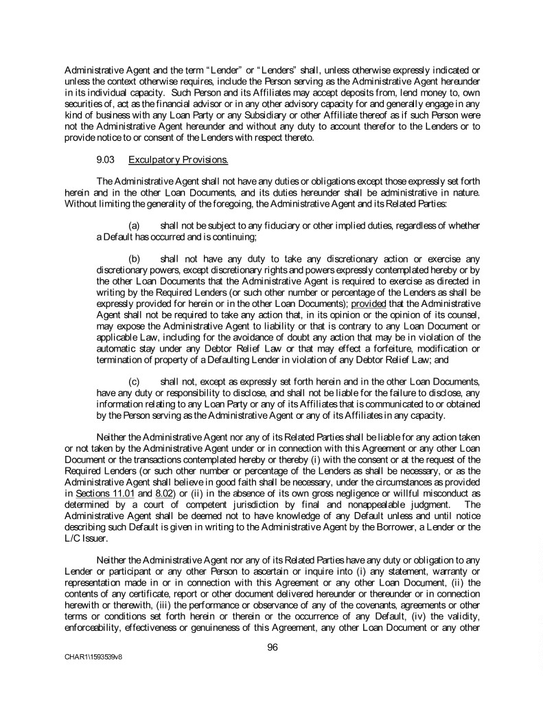Administrative Agent and the term “Lender” or “Lenders” shall, unless otherwise expressly indicated or unless the context otherwise requires, include the Person serving as the Administrative Agent hereunder in its individual capacity. Such Person and its Affiliates may accept deposits from, lend money to, own securities of, act as the financial advisor or in any other advisory capacity for and generally engage in any kind of business with any Loan Party or any Subsidiary or other Affiliate thereof as if such Person were not the Administrative Agent hereunder and without any duty to account therefor to the Lenders or to provide notice to or consent of the Lenders with respect thereto. 9.03 Exculpatory Provisions. The Administrative Agent shall not have any duties or obligations except those expressly set forth herein and in the other Loan Documents, and its duties hereunder shall be administrative in nature. Without limiting the generality of the foregoing, the Administrative Agent and its Related Parties: (a) shall not be subject to any fiduciary or other implied duties, regardless of whether a Default has occurred and is continuing; (b) shall not have any duty to take any discretionary action or exercise any discretionary powers, except discretionary rights and powers expressly contemplated hereby or by the other Loan Documents that the Administrative Agent is required to exercise as directed in writing by the Required Lenders (or such other number or percentage of the Lenders as shall be expressly provided for herein or in the other Loan Documents); provided that the Administrative Agent shall not be required to take any action that, in its opinion or the opinion of its counsel, may expose the Administrative Agent to liability or that is contrary to any Loan Document or applicable Law, including for the avoidance of doubt any action that may be in violation of the automatic stay under any Debtor Relief Law or that may effect a forfeiture, modification or termination of property of a Defaulting Lender in violation of any Debtor Relief Law; and (c) shall not, except as expressly set forth herein and in the other Loan Documents, have any duty or responsibility to disclose, and shall not be liable for the failure to disclose, any information relating to any Loan Party or any of its Affiliates that is communicated to or obtained by the Person serving as the Administrative Agent or any of its Affiliates in any capacity. Neither the Administrative Agent nor any of its Related Parties shall be liable for any action taken or not taken by the Administrative Agent under or in connection with this Agreement or any other Loan Document or the transactions contemplated hereby or thereby (i) with the consent or at the request of the Required Lenders (or such other number or percentage of the Lenders as shall be necessary, or as the Administrative Agent shall believe in good faith shall be necessary, under the circumstances as provided in Sections 11.01 and 8.02) or (ii) in the absence of its own gross negligence or willful misconduct as determined by a court of competent jurisdiction by final and nonappealable judgment. The Administrative Agent shall be deemed not to have knowledge of any Default unless and until notice describing such Default is given in writing to the Administrative Agent by the Borrower, a Lender or the L/C Issuer. Neither the Administrative Agent nor any of its Related Parties have any duty or obligation to any Lender or participant or any other Person to ascertain or inquire into (i) any statement, warranty or representation made in or in connection with this Agreement or any other Loan Document, (ii) the contents of any certificate, report or other document delivered hereunder or thereunder or in connection herewith or therewith, (iii) the performance or observance of any of the covenants, agreements or other terms or conditions set forth herein or therein or the occurrence of any Default, (iv) the validity, enforceability, effectiveness or genuineness of this Agreement, any other Loan Document or any other 96 CHAR1\1593539v8