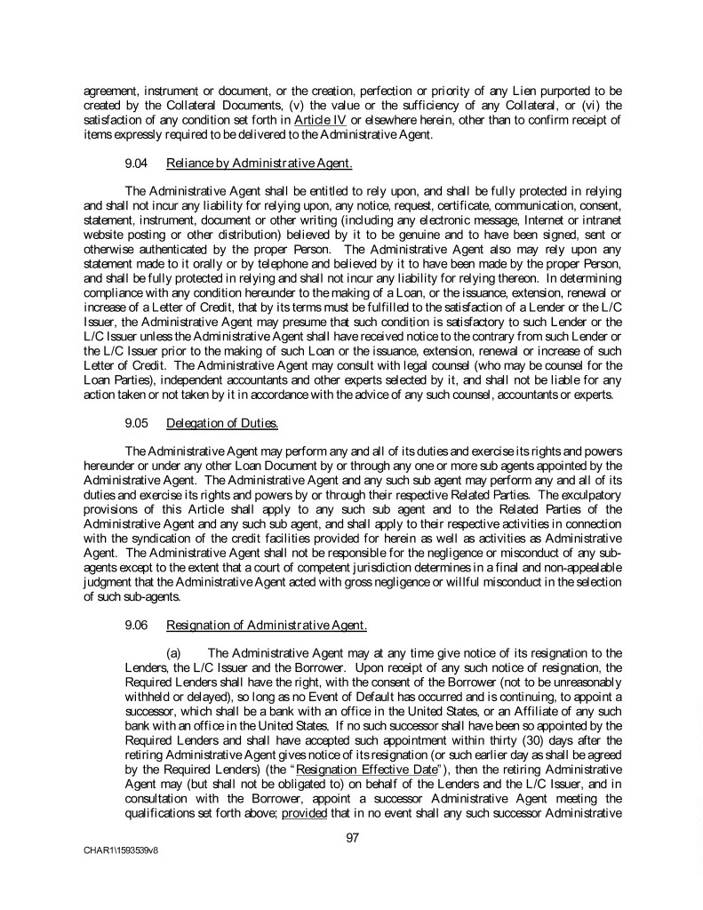 agreement, instrument or document, or the creation, perfection or priority of any Lien purported to be created by the Collateral Documents, (v) the value or the sufficiency of any Collateral, or (vi) the satisfaction of any condition set forth in Article IV or elsewhere herein, other than to confirm receipt of items expressly required to be delivered to the Administrative Agent. 9.04 Reliance by Administrative Agent. The Administrative Agent shall be entitled to rely upon, and shall be fully protected in relying and shall not incur any liability for relying upon, any notice, request, certificate, communication, consent, statement, instrument, document or other writing (including any electronic message, Internet or intranet website posting or other distribution) believed by it to be genuine and to have been signed, sent or otherwise authenticated by the proper Person. The Administrative Agent also may rely upon any statement made to it orally or by telephone and believed by it to have been made by the proper Person, and shall be fully protected in relying and shall not incur any liability for relying thereon. In determining compliance with any condition hereunder to the making of a Loan, or the issuance, extension, renewal or increase of a Letter of Credit, that by its terms must be fulfilled to the satisfaction of a Lender or the L/C Issuer, the Administrative Agent may presume that such condition is satisfactory to such Lender or the L/C Issuer unless the Administrative Agent shall have received notice to the contrary from such Lender or the L/C Issuer prior to the making of such Loan or the issuance, extension, renewal or increase of such Letter of Credit. The Administrative Agent may consult with legal counsel (who may be counsel for the Loan Parties), independent accountants and other experts selected by it, and shall not be liable for any action taken or not taken by it in accordance with the advice of any such counsel, accountants or experts. 9.05 Delegation of Duties. The Administrative Agent may perform any and all of its duties and exercise its rights and powers hereunder or under any other Loan Document by or through any one or more sub agents appointed by the Administrative Agent. The Administrative Agent and any such sub agent may perform any and all of its duties and exercise its rights and powers by or through their respective Related Parties. The exculpatory provisions of this Article shall apply to any such sub agent and to the Related Parties of the Administrative Agent and any such sub agent, and shall apply to their respective activities in connection with the syndication of the credit facilities provided for herein as well as activities as Administrative Agent. The Administrative Agent shall not be responsible for the negligence or misconduct of any sub- agents except to the extent that a court of competent jurisdiction determines in a final and non-appealable judgment that the Administrative Agent acted with gross negligence or willful misconduct in the selection of such sub-agents. 9.06 Resignation of Administrative Agent. (a) The Administrative Agent may at any time give notice of its resignation to the Lenders, the L/C Issuer and the Borrower. Upon receipt of any such notice of resignation, the Required Lenders shall have the right, with the consent of the Borrower (not to be unreasonably withheld or delayed), so long as no Event of Default has occurred and is continuing, to appoint a successor, which shall be a bank with an office in the United States, or an Affiliate of any such bank with an office in the United States. If no such successor shall have been so appointed by the Required Lenders and shall have accepted such appointment within thirty (30) days after the retiring Administrative Agent gives notice of its resignation (or such earlier day as shall be agreed by the Required Lenders) (the “Resignation Effective Date”), then the retiring Administrative Agent may (but shall not be obligated to) on behalf of the Lenders and the L/C Issuer, and in consultation with the Borrower, appoint a successor Administrative Agent meeting the qualifications set forth above; provided that in no event shall any such successor Administrative 97 CHAR1\1593539v8