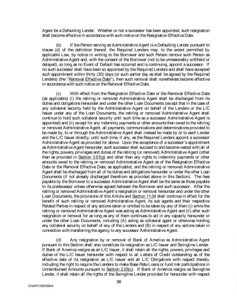 Agent be a Defaulting Lender. Whether or not a successor has been appointed, such resignation shall become effective in accordance with such notice on the Resignation Effective Date. (b) If the Person serving as Administrative Agent is a Defaulting Lender pursuant to clause (d) of the definition thereof, the Required Lenders may, to the extent permitted by applicable Law, by notice in writing to the Borrower and such Person remove such Person as Administrative Agent and, with the consent of the Borrower (not to be unreasonably withheld or delayed), so long as no Event of Default has occurred and is continuing, appoint a successor. If no such successor shall have been so appointed by the Required Lenders and shall have accepted such appointment within thirty (30) days (or such earlier day as shall be agreed by the Required Lenders) (the “Removal Effective Date”), then such removal shall nonetheless become effective in accordance with such notice on the Removal Effective Date. (c) With effect from the Resignation Effective Date or the Removal Effective Date (as applicable) (i) the retiring or removed Administrative Agent shall be discharged from its duties and obligations hereunder and under the other Loan Documents (except that in the case of any collateral security held by the Administrative Agent on behalf of the Lenders or the L/C Issuer under any of the Loan Documents, the retiring or removed Administrative Agent shall continue to hold such collateral security until such time as a successor Administrative Agent is appointed) and (ii) except for any indemnity payments or other amounts then owed to the retiring or removed Administrative Agent, all payments, communications and determinations provided to be made by, to or through the Administrative Agent shall instead be made by or to each Lender and the L/C Issuer directly, until such time, if any, as the Required Lenders appoint a successor Administrative Agent as provided for above. Upon the acceptance of a successor’s appointment as Administrative Agent hereunder, such successor shall succeed to and become vested with all of the rights, powers, privileges and duties of the retiring (or removed) Administrative Agent (other than as provided in Section 3.01(g) and other than any rights to indemnity payments or other amounts owed to the retiring or removed Administrative Agent as of the Resignation Effective Date or the Removal Effective Date, as applicable), and the retiring or removed Administrative Agent shall be discharged from all of its duties and obligations hereunder or under the other Loan Documents (if not already discharged therefrom as provided above in this Section). The fees payable by the Borrower to a successor Administrative Agent shall be the same as those payable to its predecessor unless otherwise agreed between the Borrower and such successor. After the retiring or removed Administrative Agent’s resignation or removal hereunder and under the other Loan Documents, the provisions of this Article and Section 11.04 shall continue in effect for the benefit of such retiring or removed Administrative Agent, its sub agents and their respective Related Parties in respect of any actions taken or omitted to be taken by any of them (i) while the retiring or removed Administrative Agent was acting as Administrative Agent and (ii) after such resignation or removal for as long as any of them continues to act in any capacity hereunder or under the other Loan Documents, including (A) acting as collateral agent or otherwise holding any collateral security on behalf of any of the Lenders and (B) in respect of any actions taken in connection with transferring the agency to any successor Administrative Agent. (d) Any resignation by or removal of Bank of America as Administrative Agent pursuant to this Section shall also constitute its resignation as L/C Issuer and Swingline Lender. If Bank of America resigns as an L/C Issuer, it shall retain all the rights, powers, privileges and duties of the L/C Issuer hereunder with respect to all Letters of Credit outstanding as of the effective date of its resignation as L/C Issuer and all L/C Obligations with respect thereto, including the right to require the Lenders to make Base Rate Loans or fund risk participations in Unreimbursed Amounts pursuant to Section 2.03(c). If Bank of America resigns as Swingline Lender, it shall retain all the rights of the Swingline Lender provided for hereunder with respect 98 CHAR1\1593539v8