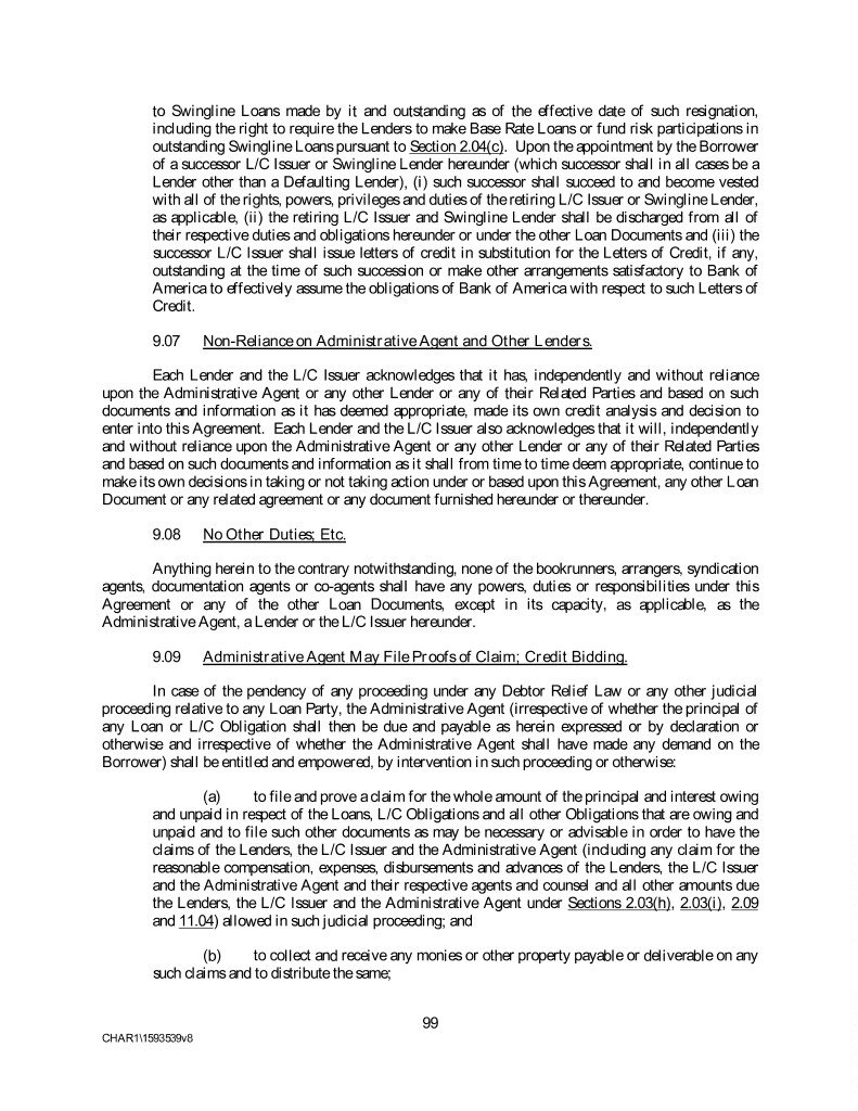 to Swingline Loans made by it and outstanding as of the effective date of such resignation, including the right to require the Lenders to make Base Rate Loans or fund risk participations in outstanding Swingline Loans pursuant to Section 2.04(c). Upon the appointment by the Borrower of a successor L/C Issuer or Swingline Lender hereunder (which successor shall in all cases be a Lender other than a Defaulting Lender), (i) such successor shall succeed to and become vested with all of the rights, powers, privileges and duties of the retiring L/C Issuer or Swingline Lender, as applicable, (ii) the retiring L/C Issuer and Swingline Lender shall be discharged from all of their respective duties and obligations hereunder or under the other Loan Documents and (iii) the successor L/C Issuer shall issue letters of credit in substitution for the Letters of Credit, if any, outstanding at the time of such succession or make other arrangements satisfactory to Bank of America to effectively assume the obligations of Bank of America with respect to such Letters of Credit. 9.07 Non-Reliance on Administrative Agent and Other Lenders. Each Lender and the L/C Issuer acknowledges that it has, independently and without reliance upon the Administrative Agent or any other Lender or any of their Related Parties and based on such documents and information as it has deemed appropriate, made its own credit analysis and decision to enter into this Agreement. Each Lender and the L/C Issuer also acknowledges that it will, independently and without reliance upon the Administrative Agent or any other Lender or any of their Related Parties and based on such documents and information as it shall from time to time deem appropriate, continue to make its own decisions in taking or not taking action under or based upon this Agreement, any other Loan Document or any related agreement or any document furnished hereunder or thereunder. 9.08 No Other Duties; Etc. Anything herein to the contrary notwithstanding, none of the bookrunners, arrangers, syndication agents, documentation agents or co-agents shall have any powers, duties or responsibilities under this Agreement or any of the other Loan Documents, except in its capacity, as applicable, as the Administrative Agent, a Lender or the L/C Issuer hereunder. 9.09 Administrative Agent May File Proofs of Claim; Credit Bidding. In case of the pendency of any proceeding under any Debtor Relief Law or any other judicial proceeding relative to any Loan Party, the Administrative Agent (irrespective of whether the principal of any Loan or L/C Obligation shall then be due and payable as herein expressed or by declaration or otherwise and irrespective of whether the Administrative Agent shall have made any demand on the Borrower) shall be entitled and empowered, by intervention in such proceeding or otherwise: (a) to file and prove a claim for the whole amount of the principal and interest owing and unpaid in respect of the Loans, L/C Obligations and all other Obligations that are owing and unpaid and to file such other documents as may be necessary or advisable in order to have the claims of the Lenders, the L/C Issuer and the Administrative Agent (including any claim for the reasonable compensation, expenses, disbursements and advances of the Lenders, the L/C Issuer and the Administrative Agent and their respective agents and counsel and all other amounts due the Lenders, the L/C Issuer and the Administrative Agent under Sections 2.03(h), 2.03(i), 2.09 and 11.04) allowed in such judicial proceeding; and (b) to collect and receive any monies or other property payable or deliverable on any such claims and to distribute the same; 99 CHAR1\1593539v8