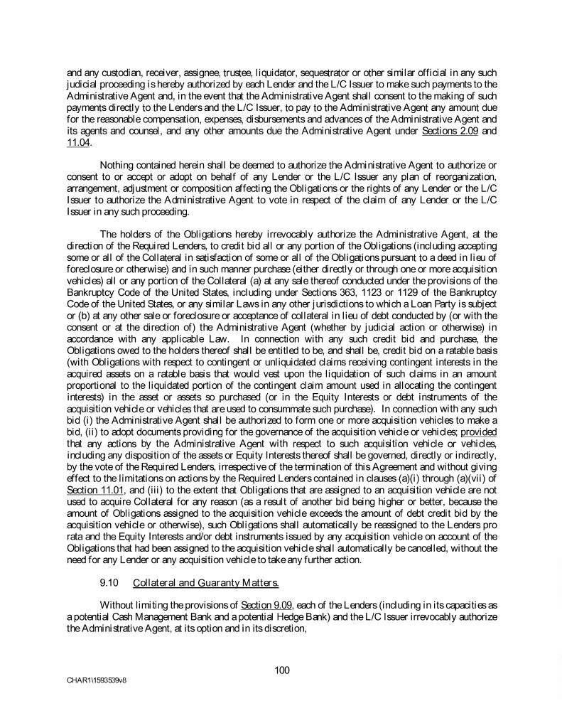 and any custodian, receiver, assignee, trustee, liquidator, sequestrator or other similar official in any such judicial proceeding is hereby authorized by each Lender and the L/C Issuer to make such payments to the Administrative Agent and, in the event that the Administrative Agent shall consent to the making of such payments directly to the Lenders and the L/C Issuer, to pay to the Administrative Agent any amount due for the reasonable compensation, expenses, disbursements and advances of the Administrative Agent and its agents and counsel, and any other amounts due the Administrative Agent under Sections 2.09 and 11.04. Nothing contained herein shall be deemed to authorize the Administrative Agent to authorize or consent to or accept or adopt on behalf of any Lender or the L/C Issuer any plan of reorganization, arrangement, adjustment or composition affecting the Obligations or the rights of any Lender or the L/C Issuer to authorize the Administrative Agent to vote in respect of the claim of any Lender or the L/C Issuer in any such proceeding. The holders of the Obligations hereby irrevocably authorize the Administrative Agent, at the direction of the Required Lenders, to credit bid all or any portion of the Obligations (including accepting some or all of the Collateral in satisfaction of some or all of the Obligations pursuant to a deed in lieu of foreclosure or otherwise) and in such manner purchase (either directly or through one or more acquisition vehicles) all or any portion of the Collateral (a) at any sale thereof conducted under the provisions of the Bankruptcy Code of the United States, including under Sections 363, 1123 or 1129 of the Bankruptcy Code of the United States, or any similar Laws in any other jurisdictions to which a Loan Party is subject or (b) at any other sale or foreclosure or acceptance of collateral in lieu of debt conducted by (or with the consent or at the direction of) the Administrative Agent (whether by judicial action or otherwise) in accordance with any applicable Law. In connection with any such credit bid and purchase, the Obligations owed to the holders thereof shall be entitled to be, and shall be, credit bid on a ratable basis (with Obligations with respect to contingent or unliquidated claims receiving contingent interests in the acquired assets on a ratable basis that would vest upon the liquidation of such claims in an amount proportional to the liquidated portion of the contingent claim amount used in allocating the contingent interests) in the asset or assets so purchased (or in the Equity Interests or debt instruments of the acquisition vehicle or vehicles that are used to consummate such purchase). In connection with any such bid (i) the Administrative Agent shall be authorized to form one or more acquisition vehicles to make a bid, (ii) to adopt documents providing for the governance of the acquisition vehicle or vehicles; provided that any actions by the Administrative Agent with respect to such acquisition vehicle or vehicles, including any disposition of the assets or Equity Interests thereof shall be governed, directly or indirectly, by the vote of the Required Lenders, irrespective of the termination of this Agreement and without giving effect to the limitations on actions by the Required Lenders contained in clauses (a)(i) through (a)(vii) of Section 11.01, and (iii) to the extent that Obligations that are assigned to an acquisition vehicle are not used to acquire Collateral for any reason (as a result of another bid being higher or better, because the amount of Obligations assigned to the acquisition vehicle exceeds the amount of debt credit bid by the acquisition vehicle or otherwise), such Obligations shall automatically be reassigned to the Lenders pro rata and the Equity Interests and/or debt instruments issued by any acquisition vehicle on account of the Obligations that had been assigned to the acquisition vehicle shall automatically be cancelled, without the need for any Lender or any acquisition vehicle to take any further action. 9.10 Collateral and Guaranty Matters. Without limiting the provisions of Section 9.09, each of the Lenders (including in its capacities as a potential Cash Management Bank and a potential Hedge Bank) and the L/C Issuer irrevocably authorize the Administrative Agent, at its option and in its discretion, 100 CHAR1\1593539v8