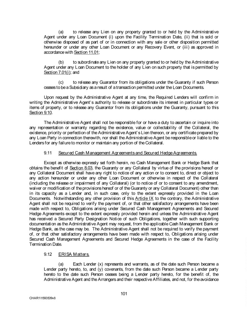 (a) to release any Lien on any property granted to or held by the Administrative Agent under any Loan Document (i) upon the Facility Termination Date, (ii) that is sold or otherwise disposed of as part of or in connection with any sale or other disposition permitted hereunder or under any other Loan Document or any Recovery Event, or (iii) as approved in accordance with Section 11.01; (b) to subordinate any Lien on any property granted to or held by the Administrative Agent under any Loan Document to the holder of any Lien on such property that is permitted by Section 7.01(i); and (c) to release any Guarantor from its obligations under the Guaranty if such Person ceases to be a Subsidiary as a result of a transaction permitted under the Loan Documents. Upon request by the Administrative Agent at any time, the Required Lenders will confirm in writing the Administrative Agent’s authority to release or subordinate its interest in particular types or items of property, or to release any Guarantor from its obligations under the Guaranty, pursuant to this Section 9.10. The Administrative Agent shall not be responsible for or have a duty to ascertain or inquire into any representation or warranty regarding the existence, value or collectability of the Collateral, the existence, priority or perfection of the Administrative Agent’s Lien thereon, or any certificate prepared by any Loan Party in connection therewith, nor shall the Administrative Agent be responsible or liable to the Lenders for any failure to monitor or maintain any portion of the Collateral. 9.11 Secured Cash Management Agreements and Secured Hedge Agreements. Except as otherwise expressly set forth herein, no Cash Management Bank or Hedge Bank that obtains the benefit of Section 8.03, the Guaranty or any Collateral by virtue of the provisions hereof or any Collateral Document shall have any right to notice of any action or to consent to, direct or object to any action hereunder or under any other Loan Document or otherwise in respect of the Collateral (including the release or impairment of any Collateral) (or to notice of or to consent to any amendment, waiver or modification of the provisions hereof or of the Guaranty or any Collateral Document) other than in its capacity as a Lender and, in such case, only to the extent expressly provided in the Loan Documents. Notwithstanding any other provision of this Article IX to the contrary, the Administrative Agent shall not be required to verify the payment of, or that other satisfactory arrangements have been made with respect to, Obligations arising under Secured Cash Management Agreements and Secured Hedge Agreements except to the extent expressly provided herein and unless the Administrative Agent has received a Secured Party Designation Notice of such Obligations, together with such supporting documentation as the Administrative Agent may request, from the applicable Cash Management Bank or Hedge Bank, as the case may be. The Administrative Agent shall not be required to verify the payment of, or that other satisfactory arrangements have been made with respect to, Obligations arising under Secured Cash Management Agreements and Secured Hedge Agreements in the case of the Facility Termination Date. 9.12 ERISA Matters. (a) Each Lender (x) represents and warrants, as of the date such Person became a Lender party hereto, to, and (y) covenants, from the date such Person became a Lender party hereto to the date such Person ceases being a Lender party hereto, for the benefit of, the Administrative Agent and the Arrangers and their respective Affiliates, and not, for the avoidance 101 CHAR1\1593539v8