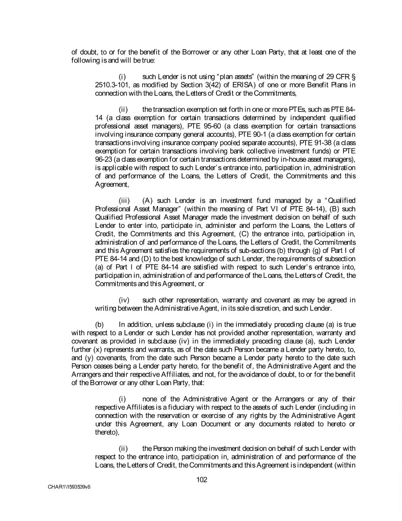 of doubt, to or for the benefit of the Borrower or any other Loan Party, that at least one of the following is and will be true: (i) such Lender is not using “plan assets” (within the meaning of 29 CFR § 2510.3-101, as modified by Section 3(42) of ERISA) of one or more Benefit Plans in connection with the Loans, the Letters of Credit or the Commitments, (ii) the transaction exemption set forth in one or more PTEs, such as PTE 84- 14 (a class exemption for certain transactions determined by independent qualified professional asset managers), PTE 95-60 (a class exemption for certain transactions involving insurance company general accounts), PTE 90-1 (a class exemption for certain transactions involving insurance company pooled separate accounts), PTE 91-38 (a class exemption for certain transactions involving bank collective investment funds) or PTE 96-23 (a class exemption for certain transactions determined by in-house asset managers), is applicable with respect to such Lender’s entrance into, participation in, administration of and performance of the Loans, the Letters of Credit, the Commitments and this Agreement, (iii) (A) such Lender is an investment fund managed by a “Qualified Professional Asset Manager” (within the meaning of Part VI of PTE 84-14), (B) such Qualified Professional Asset Manager made the investment decision on behalf of such Lender to enter into, participate in, administer and perform the Loans, the Letters of Credit, the Commitments and this Agreement, (C) the entrance into, participation in, administration of and performance of the Loans, the Letters of Credit, the Commitments and this Agreement satisfies the requirements of sub-sections (b) through (g) of Part I of PTE 84-14 and (D) to the best knowledge of such Lender, the requirements of subsection (a) of Part I of PTE 84-14 are satisfied with respect to such Lender’s entrance into, participation in, administration of and performance of the Loans, the Letters of Credit, the Commitments and this Agreement, or (iv) such other representation, warranty and covenant as may be agreed in writing between the Administrative Agent, in its sole discretion, and such Lender. (b) In addition, unless subclause (i) in the immediately preceding clause (a) is true with respect to a Lender or such Lender has not provided another representation, warranty and covenant as provided in subclause (iv) in the immediately preceding clause (a), such Lender further (x) represents and warrants, as of the date such Person became a Lender party hereto, to, and (y) covenants, from the date such Person became a Lender party hereto to the date such Person ceases being a Lender party hereto, for the benefit of, the Administrative Agent and the Arrangers and their respective Affiliates, and not, for the avoidance of doubt, to or for the benefit of the Borrower or any other Loan Party, that: (i) none of the Administrative Agent or the Arrangers or any of their respective Affiliates is a fiduciary with respect to the assets of such Lender (including in connection with the reservation or exercise of any rights by the Administrative Agent under this Agreement, any Loan Document or any documents related to hereto or thereto), (ii) the Person making the investment decision on behalf of such Lender with respect to the entrance into, participation in, administration of and performance of the Loans, the Letters of Credit, the Commitments and this Agreement is independent (within 102 CHAR1\1593539v8