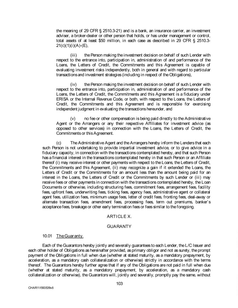 the meaning of 29 CFR § 2510.3-21) and is a bank, an insurance carrier, an investment adviser, a broker-dealer or other person that holds, or has under management or control, total assets of at least $50 million, in each case as described in 29 CFR § 2510.3- 21(c)(1)(i)(A)-(E), (iii) the Person making the investment decision on behalf of such Lender with respect to the entrance into, participation in, administration of and performance of the Loans, the Letters of Credit, the Commitments and this Agreement is capable of evaluating investment risks independently, both in general and with regard to particular transactions and investment strategies (including in respect of the Obligations), (iv) the Person making the investment decision on behalf of such Lender with respect to the entrance into, participation in, administration of and performance of the Loans, the Letters of Credit, the Commitments and this Agreement is a fiduciary under ERISA or the Internal Revenue Code, or both, with respect to the Loans, the Letters of Credit, the Commitments and this Agreement and is responsible for exercising independent judgment in evaluating the transactions hereunder, and (v) no fee or other compensation is being paid directly to the Administrative Agent or the Arrangers or any their respective Affiliates for investment advice (as opposed to other services) in connection with the Loans, the Letters of Credit, the Commitments or this Agreement. (c) The Administrative Agent and the Arrangers hereby inform the Lenders that each such Person is not undertaking to provide impartial investment advice, or to give advice in a fiduciary capacity, in connection with the transactions contemplated hereby, and that such Person has a financial interest in the transactions contemplated hereby in that such Person or an Affiliate thereof (i) may receive interest or other payments with respect to the Loans, the Letters of Credit, the Commitments and this Agreement, (ii) may recognize a gain if it extended the Loans, the Letters of Credit or the Commitments for an amount less than the amount being paid for an interest in the Loans, the Letters of Credit or the Commitments by such Lender or (iii) may receive fees or other payments in connection with the transactions contemplated hereby, the Loan Documents or otherwise, including structuring fees, commitment fees, arrangement fees, facility fees, upfront fees, underwriting fees, ticking fees, agency fees, administrative agent or collateral agent fees, utilization fees, minimum usage fees, letter of credit fees, fronting fees, deal-away or alternate transaction fees, amendment fees, processing fees, term out premiums, banker’s acceptance fees, breakage or other early termination fees or fees similar to the foregoing. ARTICLE X. GUARANTY 10.01 The Guaranty. Each of the Guarantors hereby jointly and severally guarantees to each Lender, the L/C Issuer and each other holder of Obligations as hereinafter provided, as primary obligor and not as surety, the prompt payment of the Obligations in full when due (whether at stated maturity, as a mandatory prepayment, by acceleration, as a mandatory cash collateralization or otherwise) strictly in accordance with the terms thereof. The Guarantors hereby further agree that if any of the Obligations are not paid in full when due (whether at stated maturity, as a mandatory prepayment, by acceleration, as a mandatory cash collateralization or otherwise), the Guarantors will, jointly and severally, promptly pay the same, without 103 CHAR1\1593539v8