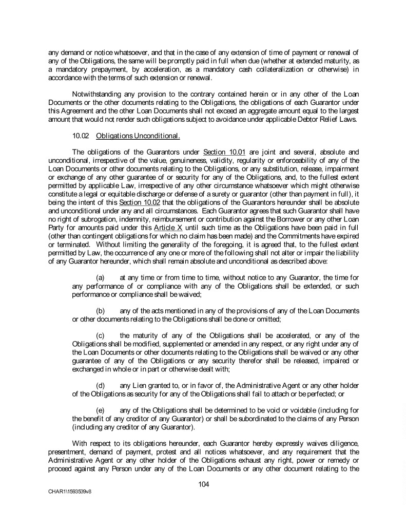 any demand or notice whatsoever, and that in the case of any extension of time of payment or renewal of any of the Obligations, the same will be promptly paid in full when due (whether at extended maturity, as a mandatory prepayment, by acceleration, as a mandatory cash collateralization or otherwise) in accordance with the terms of such extension or renewal. Notwithstanding any provision to the contrary contained herein or in any other of the Loan Documents or the other documents relating to the Obligations, the obligations of each Guarantor under this Agreement and the other Loan Documents shall not exceed an aggregate amount equal to the largest amount that would not render such obligations subject to avoidance under applicable Debtor Relief Laws. 10.02 Obligations Unconditional. The obligations of the Guarantors under Section 10.01 are joint and several, absolute and unconditional, irrespective of the value, genuineness, validity, regularity or enforceability of any of the Loan Documents or other documents relating to the Obligations, or any substitution, release, impairment or exchange of any other guarantee of or security for any of the Obligations, and, to the fullest extent permitted by applicable Law, irrespective of any other circumstance whatsoever which might otherwise constitute a legal or equitable discharge or defense of a surety or guarantor (other than payment in full), it being the intent of this Section 10.02 that the obligations of the Guarantors hereunder shall be absolute and unconditional under any and all circumstances. Each Guarantor agrees that such Guarantor shall have no right of subrogation, indemnity, reimbursement or contribution against the Borrower or any other Loan Party for amounts paid under this Article X until such time as the Obligations have been paid in full (other than contingent obligations for which no claim has been made) and the Commitments have expired or terminated. Without limiting the generality of the foregoing, it is agreed that, to the fullest extent permitted by Law, the occurrence of any one or more of the following shall not alter or impair the liability of any Guarantor hereunder, which shall remain absolute and unconditional as described above: (a) at any time or from time to time, without notice to any Guarantor, the time for any performance of or compliance with any of the Obligations shall be extended, or such performance or compliance shall be waived; (b) any of the acts mentioned in any of the provisions of any of the Loan Documents or other documents relating to the Obligations shall be done or omitted; (c) the maturity of any of the Obligations shall be accelerated, or any of the Obligations shall be modified, supplemented or amended in any respect, or any right under any of the Loan Documents or other documents relating to the Obligations shall be waived or any other guarantee of any of the Obligations or any security therefor shall be released, impaired or exchanged in whole or in part or otherwise dealt with; (d) any Lien granted to, or in favor of, the Administrative Agent or any other holder of the Obligations as security for any of the Obligations shall fail to attach or be perfected; or (e) any of the Obligations shall be determined to be void or voidable (including for the benefit of any creditor of any Guarantor) or shall be subordinated to the claims of any Person (including any creditor of any Guarantor). With respect to its obligations hereunder, each Guarantor hereby expressly waives diligence, presentment, demand of payment, protest and all notices whatsoever, and any requirement that the Administrative Agent or any other holder of the Obligations exhaust any right, power or remedy or proceed against any Person under any of the Loan Documents or any other document relating to the 104 CHAR1\1593539v8