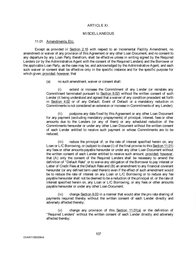 ARTICLE XI. MISCELLANEOUS 11.01 Amendments, Etc. Except as provided in Section 2.16 with respect to an Incremental Facility Amendment, no amendment or waiver of any provision of this Agreement or any other Loan Document, and no consent to any departure by any Loan Party therefrom, shall be effective unless in writing signed by the Required Lenders (or by the Administrative Agent with the consent of the Required Lenders) and the Borrower or the applicable Loan Party, as the case may be, and acknowledged by the Administrative Agent, and each such waiver or consent shall be effective only in the specific instance and for the specific purpose for which given; provided, however, that (a) no such amendment, waiver or consent shall: (i) extend or increase the Commitment of any Lender (or reinstate any Commitment terminated pursuant to Section 8.02) without the written consent of such Lender (it being understood and agreed that a waiver of any condition precedent set forth in Section 4.02 or of any Default, Event of Default or a mandatory reduction in Commitments is not considered an extension or increase in Commitments of any Lender); (ii) postpone any date fixed by this Agreement or any other Loan Document for any payment (excluding mandatory prepayments) of principal, interest, fees or other amounts due to the Lenders (or any of them) or any scheduled reduction of the Commitments hereunder or under any other Loan Document without the written consent of each Lender entitled to receive such payment or whose Commitments are to be reduced; (iii) reduce the principal of, or the rate of interest specified herein on, any Loan or L/C Borrowing, or (subject to clause (i) of the final proviso to this Section 11.01) any fees or other amounts payable hereunder or under any other Loan Document without the written consent of each Lender entitled to receive such amount; provided, however, that (A) only the consent of the Required Lenders shall be necessary to amend the definition of “Default Rate” or to waive any obligation of the Borrower to pay interest or Letter of Credit Fees at the Default Rate and (B) an amendment to any financial covenant hereunder (or any defined term used therein) even if the effect of such amendment would be to reduce the rate of interest on any Loan or L/C Borrowing or to reduce any fee payable hereunder shall not be deemed to be a reduction of the principal of, or the rate of interest specified herein on, any Loan or L/C Borrowing, or any fees or other amounts payable hereunder or under any other Loan Document; (iv) change Section 8.03 in a manner that would alter the pro rata sharing of payments required thereby without the written consent of each Lender directly and adversely affected thereby; (v) change any provision of this Section 11.01(a) or the definition of “Required Lenders” without the written consent of each Lender directly and adversely affected thereby; 107 CHAR1\1593539v8