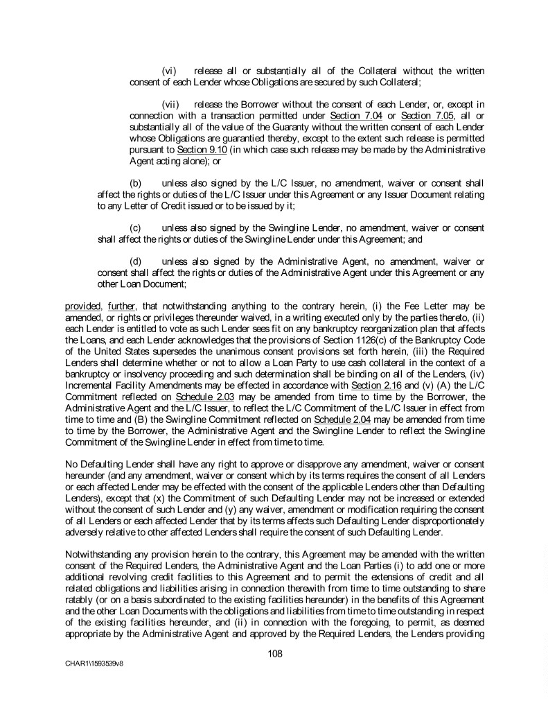 (vi) release all or substantially all of the Collateral without the written consent of each Lender whose Obligations are secured by such Collateral; (vii) release the Borrower without the consent of each Lender, or, except in connection with a transaction permitted under Section 7.04 or Section 7.05, all or substantially all of the value of the Guaranty without the written consent of each Lender whose Obligations are guarantied thereby, except to the extent such release is permitted pursuant to Section 9.10 (in which case such release may be made by the Administrative Agent acting alone); or (b) unless also signed by the L/C Issuer, no amendment, waiver or consent shall affect the rights or duties of the L/C Issuer under this Agreement or any Issuer Document relating to any Letter of Credit issued or to be issued by it; (c) unless also signed by the Swingline Lender, no amendment, waiver or consent shall affect the rights or duties of the Swingline Lender under this Agreement; and (d) unless also signed by the Administrative Agent, no amendment, waiver or consent shall affect the rights or duties of the Administrative Agent under this Agreement or any other Loan Document; provided, further, that notwithstanding anything to the contrary herein, (i) the Fee Letter may be amended, or rights or privileges thereunder waived, in a writing executed only by the parties thereto, (ii) each Lender is entitled to vote as such Lender sees fit on any bankruptcy reorganization plan that affects the Loans, and each Lender acknowledges that the provisions of Section 1126(c) of the Bankruptcy Code of the United States supersedes the unanimous consent provisions set forth herein, (iii) the Required Lenders shall determine whether or not to allow a Loan Party to use cash collateral in the context of a bankruptcy or insolvency proceeding and such determination shall be binding on all of the Lenders, (iv) Incremental Facility Amendments may be effected in accordance with Section 2.16 and (v) (A) the L/C Commitment reflected on Schedule 2.03 may be amended from time to time by the Borrower, the Administrative Agent and the L/C Issuer, to reflect the L/C Commitment of the L/C Issuer in effect from time to time and (B) the Swingline Commitment reflected on Schedule 2.04 may be amended from time to time by the Borrower, the Administrative Agent and the Swingline Lender to reflect the Swingline Commitment of the Swingline Lender in effect from time to time. No Defaulting Lender shall have any right to approve or disapprove any amendment, waiver or consent hereunder (and any amendment, waiver or consent which by its terms requires the consent of all Lenders or each affected Lender may be effected with the consent of the applicable Lenders other than Defaulting Lenders), except that (x) the Commitment of such Defaulting Lender may not be increased or extended without the consent of such Lender and (y) any waiver, amendment or modification requiring the consent of all Lenders or each affected Lender that by its terms affects such Defaulting Lender disproportionately adversely relative to other affected Lenders shall require the consent of such Defaulting Lender. Notwithstanding any provision herein to the contrary, this Agreement may be amended with the written consent of the Required Lenders, the Administrative Agent and the Loan Parties (i) to add one or more additional revolving credit facilities to this Agreement and to permit the extensions of credit and all related obligations and liabilities arising in connection therewith from time to time outstanding to share ratably (or on a basis subordinated to the existing facilities hereunder) in the benefits of this Agreement and the other Loan Documents with the obligations and liabilities from time to time outstanding in respect of the existing facilities hereunder, and (ii) in connection with the foregoing, to permit, as deemed appropriate by the Administrative Agent and approved by the Required Lenders, the Lenders providing 108 CHAR1\1593539v8