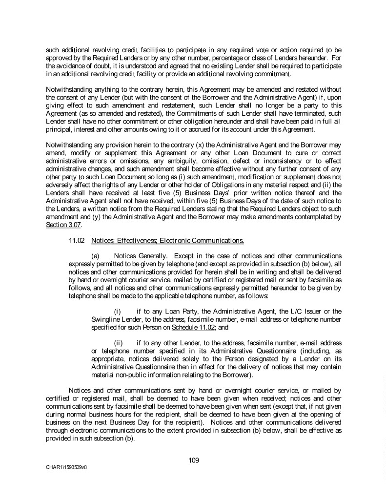 such additional revolving credit facilities to participate in any required vote or action required to be approved by the Required Lenders or by any other number, percentage or class of Lenders hereunder. For the avoidance of doubt, it is understood and agreed that no existing Lender shall be required to participate in an additional revolving credit facility or provide an additional revolving commitment. Notwithstanding anything to the contrary herein, this Agreement may be amended and restated without the consent of any Lender (but with the consent of the Borrower and the Administrative Agent) if, upon giving effect to such amendment and restatement, such Lender shall no longer be a party to this Agreement (as so amended and restated), the Commitments of such Lender shall have terminated, such Lender shall have no other commitment or other obligation hereunder and shall have been paid in full all principal, interest and other amounts owing to it or accrued for its account under this Agreement. Notwithstanding any provision herein to the contrary (x) the Administrative Agent and the Borrower may amend, modify or supplement this Agreement or any other Loan Document to cure or correct administrative errors or omissions, any ambiguity, omission, defect or inconsistency or to effect administrative changes, and such amendment shall become effective without any further consent of any other party to such Loan Document so long as (i) such amendment, modification or supplement does not adversely affect the rights of any Lender or other holder of Obligations in any material respect and (ii) the Lenders shall have received at least five (5) Business Days’ prior written notice thereof and the Administrative Agent shall not have received, within five (5) Business Days of the date of such notice to the Lenders, a written notice from the Required Lenders stating that the Required Lenders object to such amendment and (y) the Administrative Agent and the Borrower may make amendments contemplated by Section 3.07. 11.02 Notices; Effectiveness; Electronic Communications. (a) Notices Generally. Except in the case of notices and other communications expressly permitted to be given by telephone (and except as provided in subsection (b) below), all notices and other communications provided for herein shall be in writing and shall be delivered by hand or overnight courier service, mailed by certified or registered mail or sent by facsimile as follows, and all notices and other communications expressly permitted hereunder to be given by telephone shall be made to the applicable telephone number, as follows: (i) if to any Loan Party, the Administrative Agent, the L/C Issuer or the Swingline Lender, to the address, facsimile number, e-mail address or telephone number specified for such Person on Schedule 11.02; and (ii) if to any other Lender, to the address, facsimile number, e-mail address or telephone number specified in its Administrative Questionnaire (including, as appropriate, notices delivered solely to the Person designated by a Lender on its Administrative Questionnaire then in effect for the delivery of notices that may contain material non-public information relating to the Borrower). Notices and other communications sent by hand or overnight courier service, or mailed by certified or registered mail, shall be deemed to have been given when received; notices and other communications sent by facsimile shall be deemed to have been given when sent (except that, if not given during normal business hours for the recipient, shall be deemed to have been given at the opening of business on the next Business Day for the recipient). Notices and other communications delivered through electronic communications to the extent provided in subsection (b) below, shall be effective as provided in such subsection (b). 109 CHAR1\1593539v8