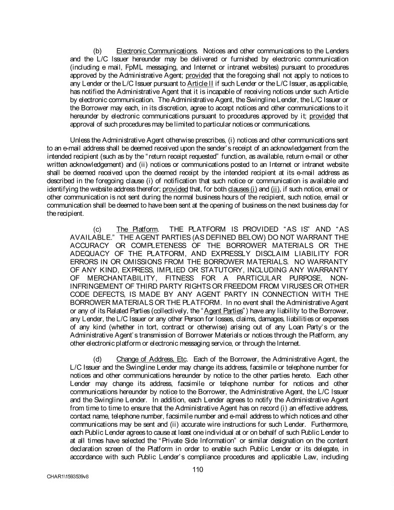 (b) Electronic Communications. Notices and other communications to the Lenders and the L/C Issuer hereunder may be delivered or furnished by electronic communication (including e mail, FpML messaging, and Internet or intranet websites) pursuant to procedures approved by the Administrative Agent; provided that the foregoing shall not apply to notices to any Lender or the L/C Issuer pursuant to Article II if such Lender or the L/C Issuer, as applicable, has notified the Administrative Agent that it is incapable of receiving notices under such Article by electronic communication. The Administrative Agent, the Swingline Lender, the L/C Issuer or the Borrower may each, in its discretion, agree to accept notices and other communications to it hereunder by electronic communications pursuant to procedures approved by it; provided that approval of such procedures may be limited to particular notices or communications. Unless the Administrative Agent otherwise prescribes, (i) notices and other communications sent to an e-mail address shall be deemed received upon the sender’s receipt of an acknowledgement from the intended recipient (such as by the “return receipt requested” function, as available, return e-mail or other written acknowledgement) and (ii) notices or communications posted to an Internet or intranet website shall be deemed received upon the deemed receipt by the intended recipient at its e-mail address as described in the foregoing clause (i) of notification that such notice or communication is available and identifying the website address therefor; provided that, for both clauses (i) and (ii), if such notice, email or other communication is not sent during the normal business hours of the recipient, such notice, email or communication shall be deemed to have been sent at the opening of business on the next business day for the recipient. (c) The Platform. THE PLATFORM IS PROVIDED “AS IS” AND “AS AVAILABLE.” THE AGENT PARTIES (AS DEFINED BELOW) DO NOT WARRANT THE ACCURACY OR COMPLETENESS OF THE BORROWER MATERIALS OR THE ADEQUACY OF THE PLATFORM, AND EXPRESSLY DISCLAIM LIABILITY FOR ERRORS IN OR OMISSIONS FROM THE BORROWER MATERIALS. NO WARRANTY OF ANY KIND, EXPRESS, IMPLIED OR STATUTORY, INCLUDING ANY WARRANTY OF MERCHANTABILITY, FITNESS FOR A PARTICULAR PURPOSE, NON- INFRINGEMENT OF THIRD PARTY RIGHTS OR FREEDOM FROM VIRUSES OR OTHER CODE DEFECTS, IS MADE BY ANY AGENT PARTY IN CONNECTION WITH THE BORROWER MATERIALS OR THE PLATFORM. In no event shall the Administrative Agent or any of its Related Parties (collectively, the “Agent Parties”) have any liability to the Borrower, any Lender, the L/C Issuer or any other Person for losses, claims, damages, liabilities or expenses of any kind (whether in tort, contract or otherwise) arising out of any Loan Party’s or the Administrative Agent’s transmission of Borrower Materials or notices through the Platform, any other electronic platform or electronic messaging service, or through the Internet. (d) Change of Address, Etc. Each of the Borrower, the Administrative Agent, the L/C Issuer and the Swingline Lender may change its address, facsimile or telephone number for notices and other communications hereunder by notice to the other parties hereto. Each other Lender may change its address, facsimile or telephone number for notices and other communications hereunder by notice to the Borrower, the Administrative Agent, the L/C Issuer and the Swingline Lender. In addition, each Lender agrees to notify the Administrative Agent from time to time to ensure that the Administrative Agent has on record (i) an effective address, contact name, telephone number, facsimile number and e-mail address to which notices and other communications may be sent and (ii) accurate wire instructions for such Lender. Furthermore, each Public Lender agrees to cause at least one individual at or on behalf of such Public Lender to at all times have selected the “Private Side Information” or similar designation on the content declaration screen of the Platform in order to enable such Public Lender or its delegate, in accordance with such Public Lender’s compliance procedures and applicable Law, including 110 CHAR1\1593539v8