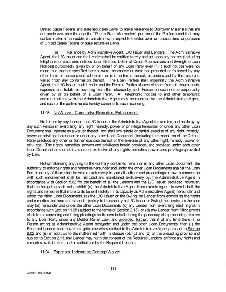 United States Federal and state securities Laws, to make reference to Borrower Materials that are not made available through the “Public Side Information” portion of the Platform and that may contain material non-public information with respect to the Borrower or its securities for purposes of United States Federal or state securities Laws. (e) Reliance by Administrative Agent, L/C Issuer and Lenders. The Administrative Agent, the L/C Issuer and the Lenders shall be entitled to rely and act upon any notices (including telephonic or electronic notices, Loan Notices, Letter of Credit Applications and Swingline Loan Notices) purportedly given by or on behalf of any Loan Party even if (i) such notices were not made in a manner specified herein, were incomplete or were not preceded or followed by any other form of notice specified herein, or (ii) the terms thereof, as understood by the recipient, varied from any confirmation thereof. The Loan Parties shall indemnify the Administrative Agent, the L/C Issuer, each Lender and the Related Parties of each of them from all losses, costs, expenses and liabilities resulting from the reliance by such Person on each notice purportedly given by or on behalf of a Loan Party. All telephonic notices to and other telephonic communications with the Administrative Agent may be recorded by the Administrative Agent, and each of the parties hereto hereby consents to such recording. 11.03 No Waiver; Cumulative Remedies; Enforcement. No failure by any Lender, the L/C Issuer or the Administrative Agent to exercise, and no delay by any such Person in exercising, any right, remedy, power or privilege hereunder or under any other Loan Document shall operate as a waiver thereof; nor shall any single or partial exercise of any right, remedy, power or privilege hereunder or under any other Loan Document (including the imposition of the Default Rate) preclude any other or further exercise thereof or the exercise of any other right, remedy, power or privilege. The rights, remedies, powers and privileges herein provided, and provided under each other Loan Document are cumulative and not exclusive of any rights, remedies, powers and privileges provided by Law. Notwithstanding anything to the contrary contained herein or in any other Loan Document, the authority to enforce rights and remedies hereunder and under the other Loan Documents against the Loan Parties or any of them shall be vested exclusively in, and all actions and proceedings at law in connection with such enforcement shall be instituted and maintained exclusively by, the Administrative Agent in accordance with Section 8.02 for the benefit of all the Lenders and the L/C Issuer; provided, however, that the foregoing shall not prohibit (a) the Administrative Agent from exercising on its own behalf the rights and remedies that inure to its benefit (solely in its capacity as Administrative Agent) hereunder and under the other Loan Documents, (b) the L/C Issuer or the Swingline Lender from exercising the rights and remedies that inure to its benefit (solely in its capacity as L/C Issuer or Swingline Lender, as the case may be) hereunder and under the other Loan Documents, (c) any Lender from exercising setoff rights in accordance with Section 11.08 (subject to the terms of Section 2.13), or (d) any Lender from filing proofs of claim or appearing and filing pleadings on its own behalf during the pendency of a proceeding relative to any Loan Party under any Debtor Relief Law; and provided, further, that if at any time there is no Person acting as Administrative Agent hereunder and under the other Loan Documents, then (i) the Required Lenders shall have the rights otherwise ascribed to the Administrative Agent pursuant to Section 8.02 and (ii) in addition to the matters set forth in clauses (b), (c) and (d) of the preceding proviso and subject to Section 2.13, any Lender may, with the consent of the Required Lenders, enforce any rights and remedies available to it and as authorized by the Required Lenders. 11.04 Expenses; Indemnity; Damage Waiver. 111 CHAR1\1593539v8
