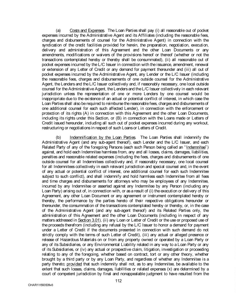 (a) Costs and Expenses. The Loan Parties shall pay (i) all reasonable out of pocket expenses incurred by the Administrative Agent and its Affiliates (including the reasonable fees, charges and disbursements of counsel for the Administrative Agent) in connection with the syndication of the credit facilities provided for herein, the preparation, negotiation, execution, delivery and administration of this Agreement and the other Loan Documents or any amendments, modifications or waivers of the provisions hereof or thereof (whether or not the transactions contemplated hereby or thereby shall be consummated), (ii) all reasonable out of pocket expenses incurred by the L/C Issuer in connection with the issuance, amendment, renewal or extension of any Letter of Credit or any demand for payment thereunder and (iii) all out of pocket expenses incurred by the Administrative Agent, any Lender or the L/C Issuer (including the reasonable fees, charges and disbursements of one outside counsel for the Administrative Agent, the Lenders and the L/C Issuer collectively and, if reasonably necessary, one local outside counsel for the Administrative Agent, the Lenders and the L/C Issuer collectively in each relevant jurisdiction unless the representation of one or more Lenders by one counsel would be inappropriate due to the existence of an actual or potential conflict of interest, in which case the Loan Parties shall also be required to reimburse the reasonable fees, charges and disbursements of one additional counsel for each such affected Lender), in connection with the enforcement or protection of its rights (A) in connection with this Agreement and the other Loan Documents, including its rights under this Section, or (B) in connection with the Loans made or Letters of Credit issued hereunder, including all such out of pocket expenses incurred during any workout, restructuring or negotiations in respect of such Loans or Letters of Credit. (b) Indemnification by the Loan Parties. The Loan Parties shall indemnify the Administrative Agent (and any sub-agent thereof), each Lender and the L/C Issuer, and each Related Party of any of the foregoing Persons (each such Person being called an “Indemnitee”) against, and hold each Indemnitee harmless from, any and all losses, claims, damages, liabilities, penalties and reasonable related expenses (including the fees, charges and disbursements of one outside counsel for all Indemnitees collectively and, if reasonably necessary, one local counsel for all Indemnitees collectively in each relevant jurisdiction and special counsel and, in the event of any actual or potential conflict of interest, one additional counsel for each such Indemnitee subject to such conflict), and shall indemnify and hold harmless each Indemnitee from all fees and time charges and disbursements for attorneys who may be employees of any Indemnitee, incurred by any Indemnitee or asserted against any Indemnitee by any Person (including any Loan Party) arising out of, in connection with, or as a result of (i) the execution or delivery of this Agreement, any other Loan Document or any agreement or instrument contemplated hereby or thereby, the performance by the parties hereto of their respective obligations hereunder or thereunder, the consummation of the transactions contemplated hereby or thereby, or, in the case of the Administrative Agent (and any sub-agent thereof) and its Related Parties only, the administration of this Agreement and the other Loan Documents (including in respect of any matters addressed in Section 3.01), (ii) any Loan or Letter of Credit or the use or proposed use of the proceeds therefrom (including any refusal by the L/C Issuer to honor a demand for payment under a Letter of Credit if the documents presented in connection with such demand do not strictly comply with the terms of such Letter of Credit), (iii) any actual or alleged presence or release of Hazardous Materials on or from any property owned or operated by a Loan Party or any of its Subsidiaries, or any Environmental Liability related in any way to a Loan Party or any of its Subsidiaries, or (iv) any actual or prospective claim, litigation, investigation or proceeding relating to any of the foregoing, whether based on contract, tort or any other theory, whether brought by a third party or by any Loan Party, and regardless of whether any Indemnitee is a party thereto; provided that such indemnity shall not, as to any Indemnitee, be available to the extent that such losses, claims, damages, liabilities or related expenses (x) are determined by a court of competent jurisdiction by final and nonappealable judgment to have resulted from the 112 CHAR1\1593539v8