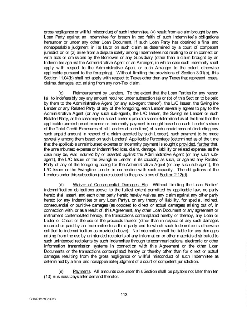 gross negligence or willful misconduct of such Indemnitee, (y) result from a claim brought by any Loan Party against an Indemnitee for breach in bad faith of such Indemnitee’s obligations hereunder or under any other Loan Document, if such Loan Party has obtained a final and nonappealable judgment in its favor on such claim as determined by a court of competent jurisdiction or (z) arise from a dispute solely among Indemnitees not relating to or in connection with acts or omissions by the Borrower or any Subsidiary (other than a claim brought by an Indemnitee against the Administrative Agent or an Arranger, in which case such indemnity shall apply with respect to the Administrative Agent or such Arranger to the extent otherwise applicable pursuant to the foregoing). Without limiting the provisions of Section 3.01(c), this Section 11.04(b) shall not apply with respect to Taxes other than any Taxes that represent losses, claims, damages, etc. arising from any non-Tax claim. (c) Reimbursement by Lenders. To the extent that the Loan Parties for any reason fail to indefeasibly pay any amount required under subsection (a) or (b) of this Section to be paid by them to the Administrative Agent (or any sub-agent thereof), the L/C Issuer, the Swingline Lender or any Related Party of any of the foregoing, each Lender severally agrees to pay to the Administrative Agent (or any such sub-agent), the L/C Issuer, the Swingline Lender or such Related Party, as the case may be, such Lender’s pro rata share (determined as of the time that the applicable unreimbursed expense or indemnity payment is sought based on each Lender’s share of the Total Credit Exposures of all Lenders at such time) of such unpaid amount (including any such unpaid amount in respect of a claim asserted by such Lender), such payment to be made severally among them based on such Lenders’ Applicable Percentage (determined as of the time that the applicable unreimbursed expense or indemnity payment is sought); provided, further that, the unreimbursed expense or indemnified loss, claim, damage, liability or related expense, as the case may be, was incurred by or asserted against the Administrative Agent (or any such sub- agent), the L/C Issuer or the Swingline Lender in its capacity as such, or against any Related Party of any of the foregoing acting for the Administrative Agent (or any such sub-agent), the L/C Issuer or the Swingline Lender in connection with such capacity. The obligations of the Lenders under this subsection (c) are subject to the provisions of Section 2.12(d). (d) Waiver of Consequential Damages, Etc. Without limiting the Loan Parties’ indemnification obligations above, to the fullest extent permitted by applicable law, no party hereto shall assert, and each other party hereto hereby waives, any claim against any other party hereto (or any Indemnitee or any Loan Party), on any theory of liability, for special, indirect, consequential or punitive damages (as opposed to direct or actual damages) arising out of, in connection with, or as a result of, this Agreement, any other Loan Document or any agreement or instrument contemplated hereby, the transactions contemplated hereby or thereby, any Loan or Letter of Credit or the use of the proceeds thereof (other than in respect of any such damages incurred or paid by an Indemnitee to a third party and to which such Indemnitee is otherwise entitled to indemnification as provided above). No Indemnitee shall be liable for any damages arising from the use by unintended recipients of any information or other materials distributed to such unintended recipients by such Indemnitee through telecommunications, electronic or other information transmission systems in connection with this Agreement or the other Loan Documents or the transactions contemplated hereby or thereby other than for direct or actual damages resulting from the gross negligence or willful misconduct of such Indemnitee as determined by a final and nonappealable judgment of a court of competent jurisdiction. (e) Payments. All amounts due under this Section shall be payable not later than ten (10) Business Days after demand therefor. 113 CHAR1\1593539v8