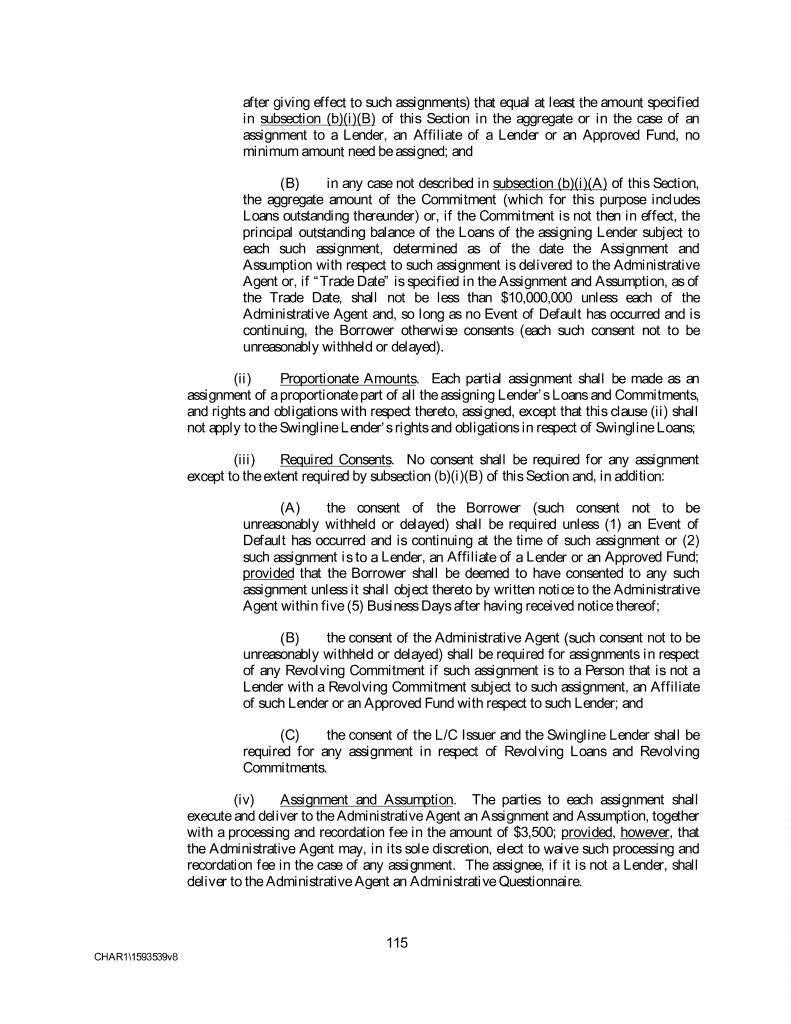 after giving effect to such assignments) that equal at least the amount specified in subsection (b)(i)(B) of this Section in the aggregate or in the case of an assignment to a Lender, an Affiliate of a Lender or an Approved Fund, no minimum amount need be assigned; and (B) in any case not described in subsection (b)(i)(A) of this Section, the aggregate amount of the Commitment (which for this purpose includes Loans outstanding thereunder) or, if the Commitment is not then in effect, the principal outstanding balance of the Loans of the assigning Lender subject to each such assignment, determined as of the date the Assignment and Assumption with respect to such assignment is delivered to the Administrative Agent or, if “Trade Date” is specified in the Assignment and Assumption, as of the Trade Date, shall not be less than $10,000,000 unless each of the Administrative Agent and, so long as no Event of Default has occurred and is continuing, the Borrower otherwise consents (each such consent not to be unreasonably withheld or delayed). (ii) Proportionate Amounts. Each partial assignment shall be made as an assignment of a proportionate part of all the assigning Lender’s Loans and Commitments, and rights and obligations with respect thereto, assigned, except that this clause (ii) shall not apply to the Swingline Lender’s rights and obligations in respect of Swingline Loans; (iii) Required Consents. No consent shall be required for any assignment except to the extent required by subsection (b)(i)(B) of this Section and, in addition: (A) the consent of the Borrower (such consent not to be unreasonably withheld or delayed) shall be required unless (1) an Event of Default has occurred and is continuing at the time of such assignment or (2) such assignment is to a Lender, an Affiliate of a Lender or an Approved Fund; provided that the Borrower shall be deemed to have consented to any such assignment unless it shall object thereto by written notice to the Administrative Agent within five (5) Business Days after having received notice thereof; (B) the consent of the Administrative Agent (such consent not to be unreasonably withheld or delayed) shall be required for assignments in respect of any Revolving Commitment if such assignment is to a Person that is not a Lender with a Revolving Commitment subject to such assignment, an Affiliate of such Lender or an Approved Fund with respect to such Lender; and (C) the consent of the L/C Issuer and the Swingline Lender shall be required for any assignment in respect of Revolving Loans and Revolving Commitments. (iv) Assignment and Assumption. The parties to each assignment shall execute and deliver to the Administrative Agent an Assignment and Assumption, together with a processing and recordation fee in the amount of $3,500; provided, however, that the Administrative Agent may, in its sole discretion, elect to waive such processing and recordation fee in the case of any assignment. The assignee, if it is not a Lender, shall deliver to the Administrative Agent an Administrative Questionnaire. 115 CHAR1\1593539v8