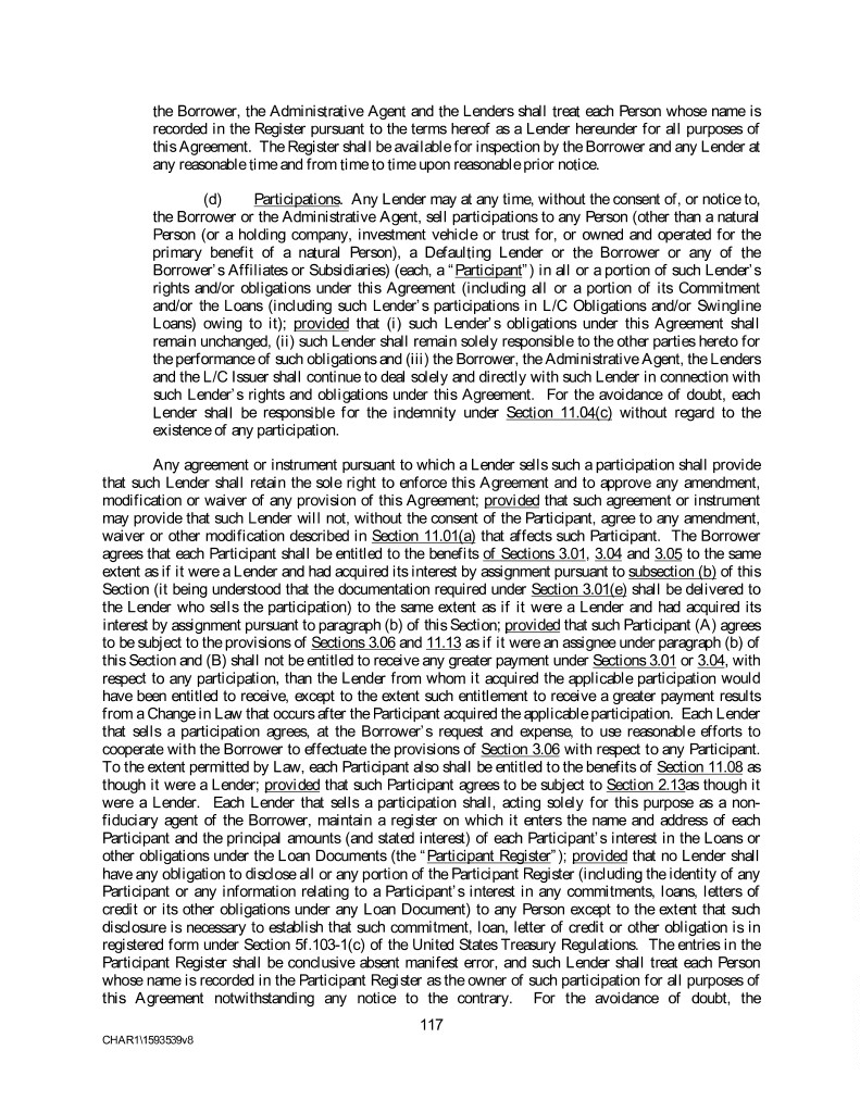 the Borrower, the Administrative Agent and the Lenders shall treat each Person whose name is recorded in the Register pursuant to the terms hereof as a Lender hereunder for all purposes of this Agreement. The Register shall be available for inspection by the Borrower and any Lender at any reasonable time and from time to time upon reasonable prior notice. (d) Participations. Any Lender may at any time, without the consent of, or notice to, the Borrower or the Administrative Agent, sell participations to any Person (other than a natural Person (or a holding company, investment vehicle or trust for, or owned and operated for the primary benefit of a natural Person), a Defaulting Lender or the Borrower or any of the Borrower’s Affiliates or Subsidiaries) (each, a “Participant”) in all or a portion of such Lender’s rights and/or obligations under this Agreement (including all or a portion of its Commitment and/or the Loans (including such Lender’s participations in L/C Obligations and/or Swingline Loans) owing to it); provided that (i) such Lender’s obligations under this Agreement shall remain unchanged, (ii) such Lender shall remain solely responsible to the other parties hereto for the performance of such obligations and (iii) the Borrower, the Administrative Agent, the Lenders and the L/C Issuer shall continue to deal solely and directly with such Lender in connection with such Lender’s rights and obligations under this Agreement. For the avoidance of doubt, each Lender shall be responsible for the indemnity under Section 11.04(c) without regard to the existence of any participation. Any agreement or instrument pursuant to which a Lender sells such a participation shall provide that such Lender shall retain the sole right to enforce this Agreement and to approve any amendment, modification or waiver of any provision of this Agreement; provided that such agreement or instrument may provide that such Lender will not, without the consent of the Participant, agree to any amendment, waiver or other modification described in Section 11.01(a) that affects such Participant. The Borrower agrees that each Participant shall be entitled to the benefits of Sections 3.01, 3.04 and 3.05 to the same extent as if it were a Lender and had acquired its interest by assignment pursuant to subsection (b) of this Section (it being understood that the documentation required under Section 3.01(e) shall be delivered to the Lender who sells the participation) to the same extent as if it were a Lender and had acquired its interest by assignment pursuant to paragraph (b) of this Section; provided that such Participant (A) agrees to be subject to the provisions of Sections 3.06 and 11.13 as if it were an assignee under paragraph (b) of this Section and (B) shall not be entitled to receive any greater payment under Sections 3.01 or 3.04, with respect to any participation, than the Lender from whom it acquired the applicable participation would have been entitled to receive, except to the extent such entitlement to receive a greater payment results from a Change in Law that occurs after the Participant acquired the applicable participation. Each Lender that sells a participation agrees, at the Borrower’s request and expense, to use reasonable efforts to cooperate with the Borrower to effectuate the provisions of Section 3.06 with respect to any Participant. To the extent permitted by Law, each Participant also shall be entitled to the benefits of Section 11.08 as though it were a Lender; provided that such Participant agrees to be subject to Section 2.13as though it were a Lender. Each Lender that sells a participation shall, acting solely for this purpose as a non- fiduciary agent of the Borrower, maintain a register on which it enters the name and address of each Participant and the principal amounts (and stated interest) of each Participant’s interest in the Loans or other obligations under the Loan Documents (the “Participant Register”); provided that no Lender shall have any obligation to disclose all or any portion of the Participant Register (including the identity of any Participant or any information relating to a Participant’s interest in any commitments, loans, letters of credit or its other obligations under any Loan Document) to any Person except to the extent that such disclosure is necessary to establish that such commitment, loan, letter of credit or other obligation is in registered form under Section 5f.103-1(c) of the United States Treasury Regulations. The entries in the Participant Register shall be conclusive absent manifest error, and such Lender shall treat each Person whose name is recorded in the Participant Register as the owner of such participation for all purposes of this Agreement notwithstanding any notice to the contrary. For the avoidance of doubt, the 117 CHAR1\1593539v8
