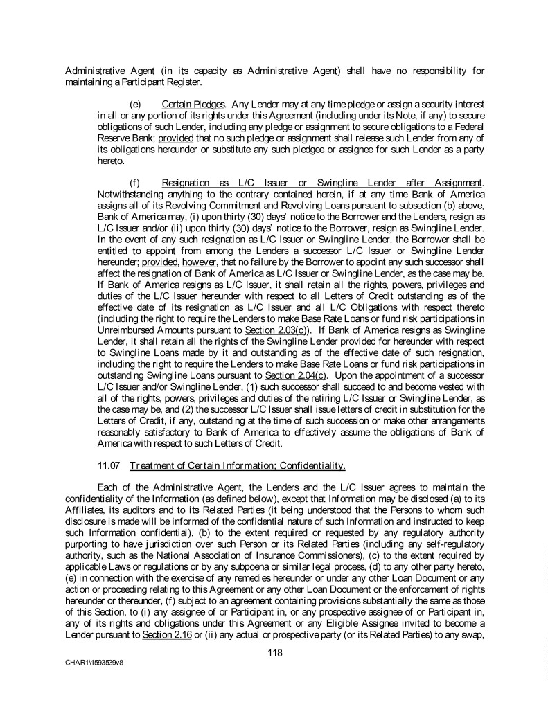 Administrative Agent (in its capacity as Administrative Agent) shall have no responsibility for maintaining a Participant Register. (e) Certain Pledges. Any Lender may at any time pledge or assign a security interest in all or any portion of its rights under this Agreement (including under its Note, if any) to secure obligations of such Lender, including any pledge or assignment to secure obligations to a Federal Reserve Bank; provided that no such pledge or assignment shall release such Lender from any of its obligations hereunder or substitute any such pledgee or assignee for such Lender as a party hereto. (f) Resignation as L/C Issuer or Swingline Lender after Assignment. Notwithstanding anything to the contrary contained herein, if at any time Bank of America assigns all of its Revolving Commitment and Revolving Loans pursuant to subsection (b) above, Bank of America may, (i) upon thirty (30) days’ notice to the Borrower and the Lenders, resign as L/C Issuer and/or (ii) upon thirty (30) days’ notice to the Borrower, resign as Swingline Lender. In the event of any such resignation as L/C Issuer or Swingline Lender, the Borrower shall be entitled to appoint from among the Lenders a successor L/C Issuer or Swingline Lender hereunder; provided, however, that no failure by the Borrower to appoint any such successor shall affect the resignation of Bank of America as L/C Issuer or Swingline Lender, as the case may be. If Bank of America resigns as L/C Issuer, it shall retain all the rights, powers, privileges and duties of the L/C Issuer hereunder with respect to all Letters of Credit outstanding as of the effective date of its resignation as L/C Issuer and all L/C Obligations with respect thereto (including the right to require the Lenders to make Base Rate Loans or fund risk participations in Unreimbursed Amounts pursuant to Section 2.03(c)). If Bank of America resigns as Swingline Lender, it shall retain all the rights of the Swingline Lender provided for hereunder with respect to Swingline Loans made by it and outstanding as of the effective date of such resignation, including the right to require the Lenders to make Base Rate Loans or fund risk participations in outstanding Swingline Loans pursuant to Section 2.04(c). Upon the appointment of a successor L/C Issuer and/or Swingline Lender, (1) such successor shall succeed to and become vested with all of the rights, powers, privileges and duties of the retiring L/C Issuer or Swingline Lender, as the case may be, and (2) the successor L/C Issuer shall issue letters of credit in substitution for the Letters of Credit, if any, outstanding at the time of such succession or make other arrangements reasonably satisfactory to Bank of America to effectively assume the obligations of Bank of America with respect to such Letters of Credit. 11.07 Treatment of Certain Information; Confidentiality. Each of the Administrative Agent, the Lenders and the L/C Issuer agrees to maintain the confidentiality of the Information (as defined below), except that Information may be disclosed (a) to its Affiliates, its auditors and to its Related Parties (it being understood that the Persons to whom such disclosure is made will be informed of the confidential nature of such Information and instructed to keep such Information confidential), (b) to the extent required or requested by any regulatory authority purporting to have jurisdiction over such Person or its Related Parties (including any self-regulatory authority, such as the National Association of Insurance Commissioners), (c) to the extent required by applicable Laws or regulations or by any subpoena or similar legal process, (d) to any other party hereto, (e) in connection with the exercise of any remedies hereunder or under any other Loan Document or any action or proceeding relating to this Agreement or any other Loan Document or the enforcement of rights hereunder or thereunder, (f) subject to an agreement containing provisions substantially the same as those of this Section, to (i) any assignee of or Participant in, or any prospective assignee of or Participant in, any of its rights and obligations under this Agreement or any Eligible Assignee invited to become a Lender pursuant to Section 2.16 or (ii) any actual or prospective party (or its Related Parties) to any swap, 118 CHAR1\1593539v8
