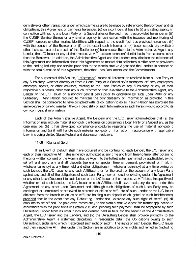 derivative or other transaction under which payments are to be made by reference to the Borrower and its obligations, this Agreement or payments hereunder, (g) on a confidential basis to (i) any rating agency in connection with rating any Loan Party or its Subsidiaries or the credit facilities provided hereunder or (ii) the CUSIP Service Bureau or any similar agency in connection with the issuance and monitoring of CUSIP numbers or other market identifiers with respect to the credit facilities provided hereunder, (h) with the consent of the Borrower or (i) to the extent such Information (x) becomes publicly available other than as a result of a breach of this Section or (y) becomes available to the Administrative Agent, any Lender, the L/C Issuer or any of their respective Affiliates on a nonconfidential basis from a source other than the Borrower. In addition, the Administrative Agent and the Lenders may disclose the existence of this Agreement and information about this Agreement to market data collectors, similar service providers to the lending industry and service providers to the Administrative Agent and the Lenders in connection with the administration of this Agreement, the other Loan Documents, and the Commitments. For purposes of this Section, “Information” means all information received from a Loan Party or any Subsidiary, whether directly or from a Loan Party or a Subsidiary’s managers, officers, employees, attorneys, agents, or other advisors, relating to the Loan Parties or any Subsidiary or any of their respective businesses, other than any such information that is available to the Administrative Agent, any Lender or the L/C Issuer on a nonconfidential basis prior to disclosure by such Loan Party or any Subsidiary. Any Person required to maintain the confidentiality of Information as provided in this Section shall be considered to have complied with its obligation to do so if such Person has exercised the same degree of care to maintain the confidentiality of such Information as such Person would accord to its own confidential information. Each of the Administrative Agent, the Lenders and the L/C Issuer acknowledges that (a) the Information may include material non-public information concerning a Loan Party or a Subsidiary, as the case may be, (b) it has developed compliance procedures regarding the use of material non-public information and (c) it will handle such material non-public information in accordance with applicable Law, including United States Federal and state securities Laws. 11.08 Rights of Setoff. If an Event of Default shall have occurred and be continuing, each Lender, the L/C Issuer and each of their respective Affiliates is hereby authorized at any time and from time to time, after obtaining the prior written consent of the Administrative Agent, to the fullest extent permitted by applicable Law, to set off and apply any and all deposits (general or special, time or demand, provisional or final, in whatever currency) at any time held and other obligations (in whatever currency) at any time owing by such Lender, the L/C Issuer or any such Affiliate to or for the credit or the account of any Loan Party against any and all of the obligations of such Loan Party now or hereafter existing under this Agreement or any other Loan Document to such Lender or the L/C Issuer or their respective Affiliates, irrespective of whether or not such Lender, the L/C Issuer or such Affiliate shall have made any demand under this Agreement or any other Loan Document and although such obligations of such Loan Party may be contingent or unmatured or are owed to a branch or office or Affiliate of such Lender or the L/C Issuer different from the branch or office or Affiliate holding such deposit or obligated on such indebtedness; provided that in the event that any Defaulting Lender shall exercise any such right of setoff, (x) all amounts so set off shall be paid over immediately to the Administrative Agent for further application in accordance with the provisions of Section 2.15 and, pending such payment, shall be segregated by such Defaulting Lender from its other funds and deemed held in trust for the benefit of the Administrative Agent, the L/C Issuer and the Lenders, and (y) the Defaulting Lender shall provide promptly to the Administrative Agent a statement describing in reasonable detail the Obligations owing to such Defaulting Lender as to which it exercised such right of setoff. The rights of each Lender, the L/C Issuer and their respective Affiliates under this Section are in addition to other rights and remedies (including 119 CHAR1\1593539v8
