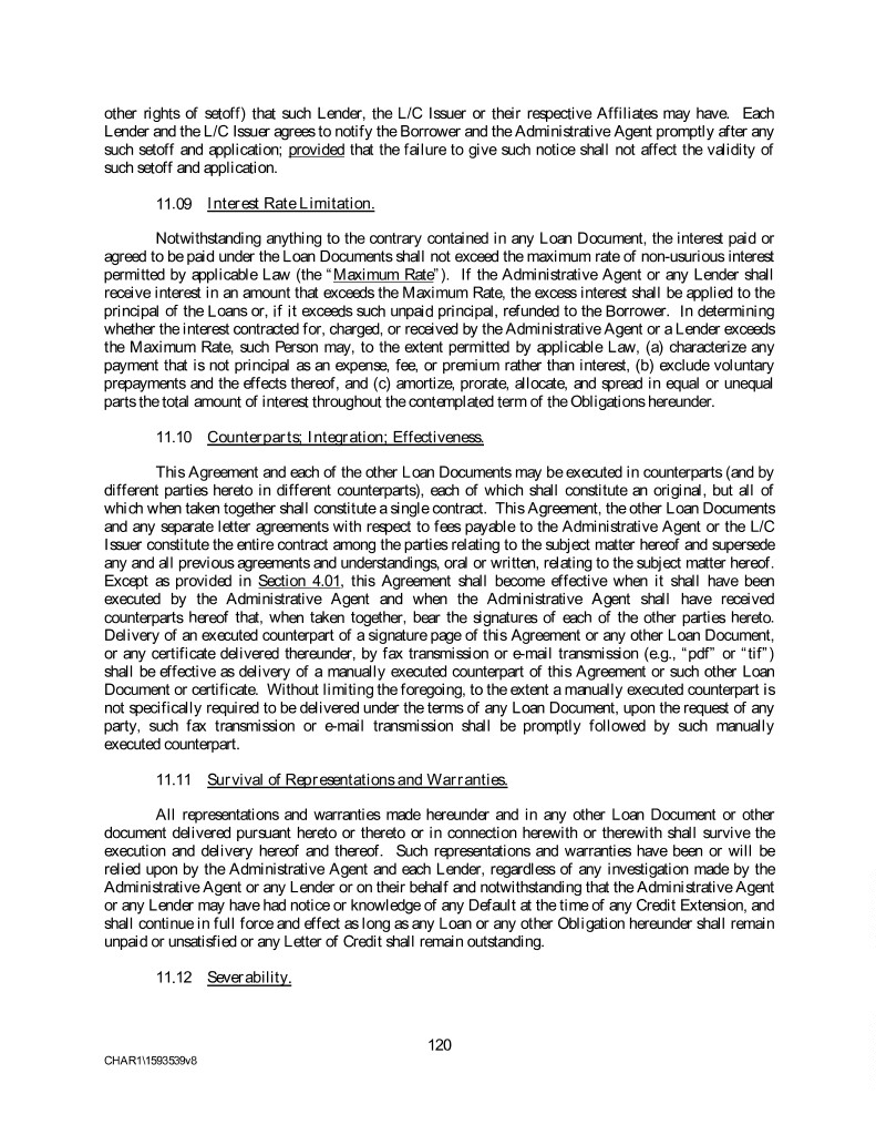 other rights of setoff) that such Lender, the L/C Issuer or their respective Affiliates may have. Each Lender and the L/C Issuer agrees to notify the Borrower and the Administrative Agent promptly after any such setoff and application; provided that the failure to give such notice shall not affect the validity of such setoff and application. 11.09 Interest Rate Limitation. Notwithstanding anything to the contrary contained in any Loan Document, the interest paid or agreed to be paid under the Loan Documents shall not exceed the maximum rate of non-usurious interest permitted by applicable Law (the “Maximum Rate”). If the Administrative Agent or any Lender shall receive interest in an amount that exceeds the Maximum Rate, the excess interest shall be applied to the principal of the Loans or, if it exceeds such unpaid principal, refunded to the Borrower. In determining whether the interest contracted for, charged, or received by the Administrative Agent or a Lender exceeds the Maximum Rate, such Person may, to the extent permitted by applicable Law, (a) characterize any payment that is not principal as an expense, fee, or premium rather than interest, (b) exclude voluntary prepayments and the effects thereof, and (c) amortize, prorate, allocate, and spread in equal or unequal parts the total amount of interest throughout the contemplated term of the Obligations hereunder. 11.10 Counterparts; Integration; Effectiveness. This Agreement and each of the other Loan Documents may be executed in counterparts (and by different parties hereto in different counterparts), each of which shall constitute an original, but all of which when taken together shall constitute a single contract. This Agreement, the other Loan Documents and any separate letter agreements with respect to fees payable to the Administrative Agent or the L/C Issuer constitute the entire contract among the parties relating to the subject matter hereof and supersede any and all previous agreements and understandings, oral or written, relating to the subject matter hereof. Except as provided in Section 4.01, this Agreement shall become effective when it shall have been executed by the Administrative Agent and when the Administrative Agent shall have received counterparts hereof that, when taken together, bear the signatures of each of the other parties hereto. Delivery of an executed counterpart of a signature page of this Agreement or any other Loan Document, or any certificate delivered thereunder, by fax transmission or e-mail transmission (e.g., “pdf” or “tif”) shall be effective as delivery of a manually executed counterpart of this Agreement or such other Loan Document or certificate. Without limiting the foregoing, to the extent a manually executed counterpart is not specifically required to be delivered under the terms of any Loan Document, upon the request of any party, such fax transmission or e-mail transmission shall be promptly followed by such manually executed counterpart. 11.11 Survival of Representations and Warranties. All representations and warranties made hereunder and in any other Loan Document or other document delivered pursuant hereto or thereto or in connection herewith or therewith shall survive the execution and delivery hereof and thereof. Such representations and warranties have been or will be relied upon by the Administrative Agent and each Lender, regardless of any investigation made by the Administrative Agent or any Lender or on their behalf and notwithstanding that the Administrative Agent or any Lender may have had notice or knowledge of any Default at the time of any Credit Extension, and shall continue in full force and effect as long as any Loan or any other Obligation hereunder shall remain unpaid or unsatisfied or any Letter of Credit shall remain outstanding. 11.12 Severability. 120 CHAR1\1593539v8